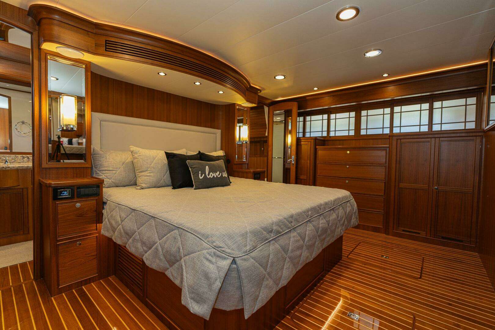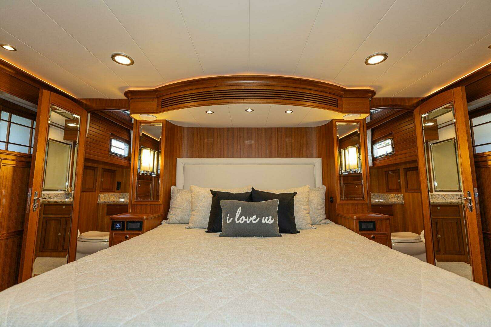 Indulge in the luxurious full beam master stateroom. A full-sized centerline king berth offers a serene and comfortable space to relax and rejuvenate. Ample storage is provided by large cedar-lined hanging lockers and curved chest of drawers on either side, ensuring all your wardrobe essentials are neatly organized. Large port windows provide stunning views at the waterline for a truly immersive experience.