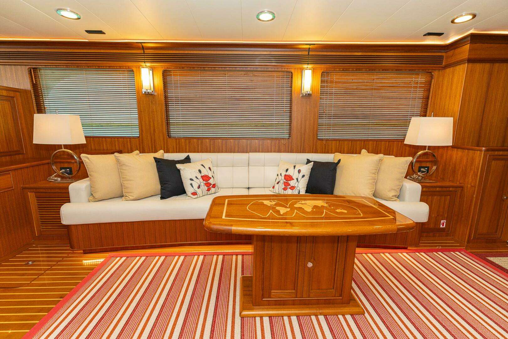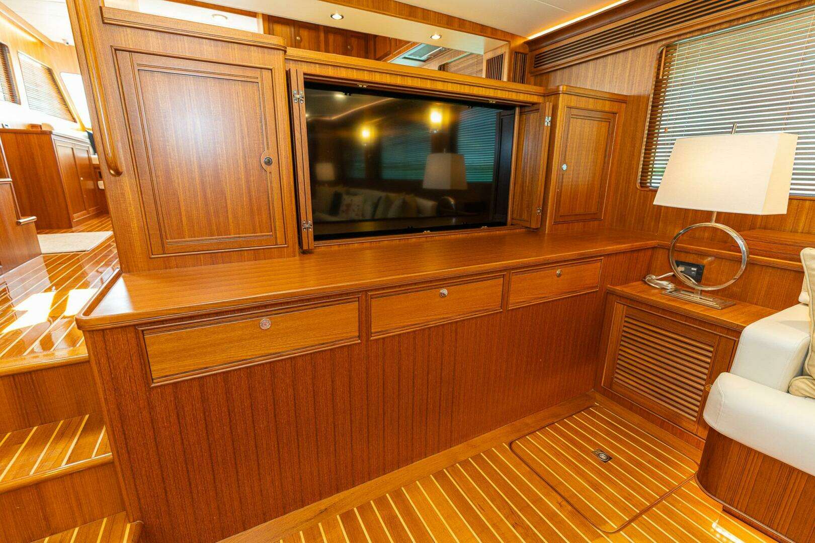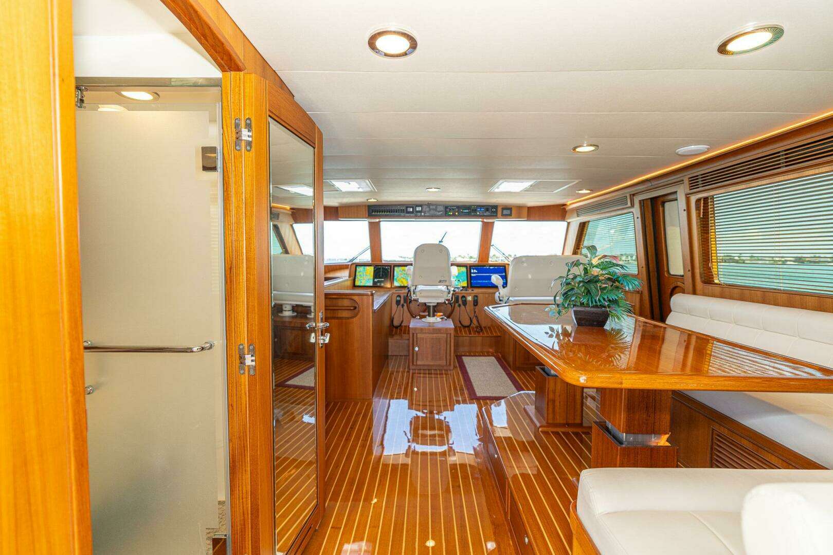 Step into the salon and be welcomed by the stunning satin teak woodwork complemented by a high gloss teak and holly sole. Expansive panoramic windows flood the area with natural light, creating a warm and inviting atmosphere. On the starboard side, a built-in settee and storage cabinet offer practicality, while comfortable free-standing chairs, a table, and a bar on the port side provide ample space for entertaining in style and comfort.