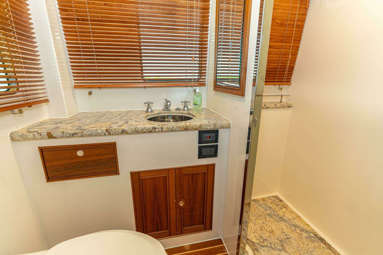 The spacious VIP stateroom features a large queen centerline berth enveloped by exquisite teak storage lockers. Guests can enjoy the comfort and luxury of a private ensuite head with a generously sized shower. Two overhead skylights create a bright and welcoming atmosphere that ensures guests will feel pampered and at ease during extended trips on the water.