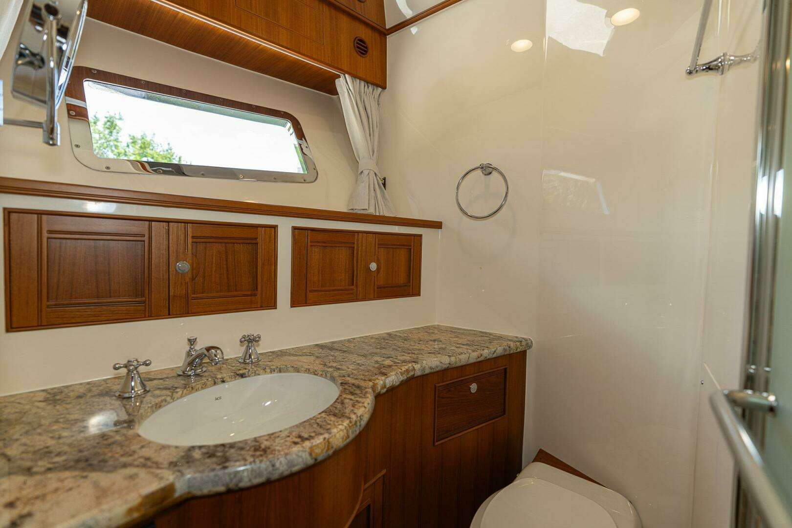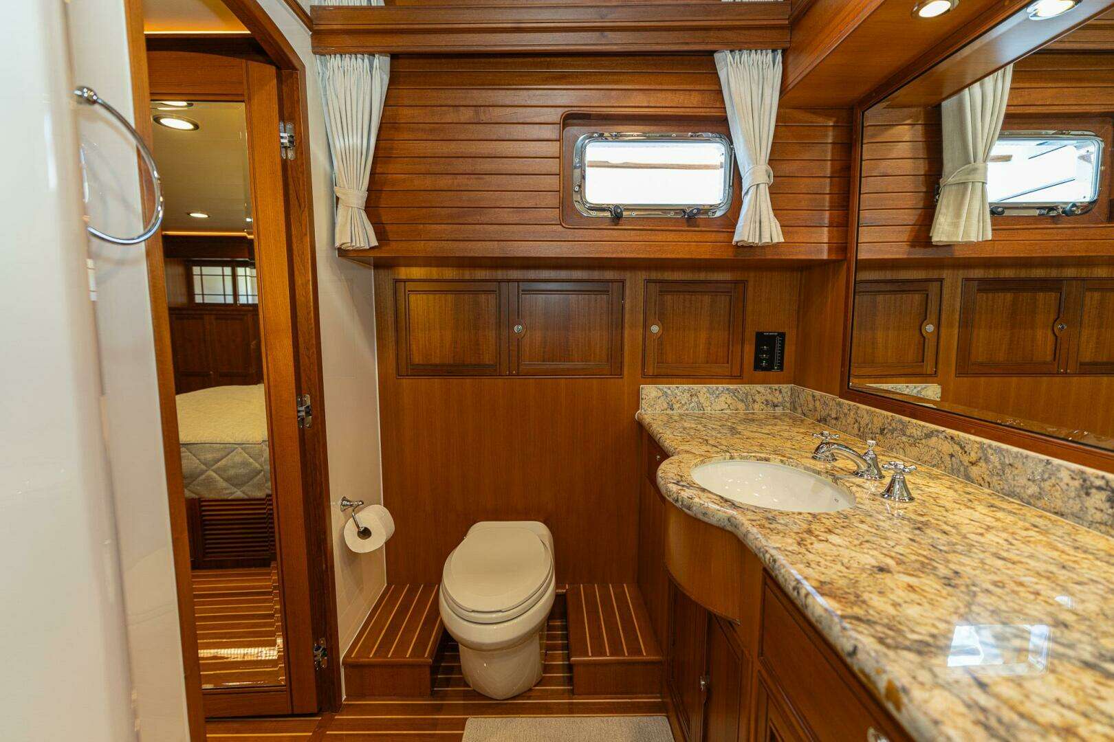 The thoughtfully designed crew area boasts a fully insulated generator machine room with storage shelves, a workbench, and a vise on the port side. On the starboard side, you'll find a beautifully finished crew quarters, complete with two crew bunks and private head. This versatile space can be repurposed as overflow accommodations for additional guests when not in use by the captain or crew.