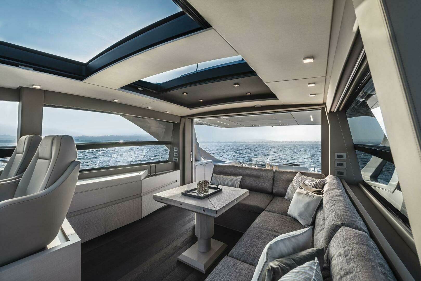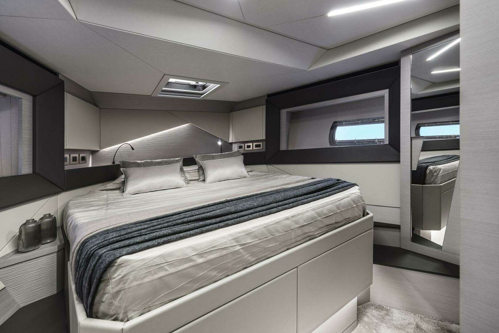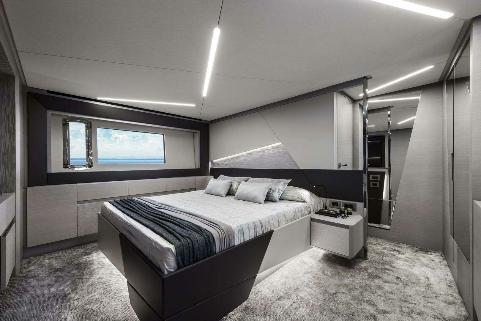 The spatial ergonomics is maximal thanks to volumes that blend technology and performance in perfect proportions. The open spaces allow the boat to be filled with pleasure and light, such as the large lounge characterized by the front openable windows and the dark glass sliding roof. The new, much larger rectangular portholes allow air and natural light to permeate the rooms below decks.