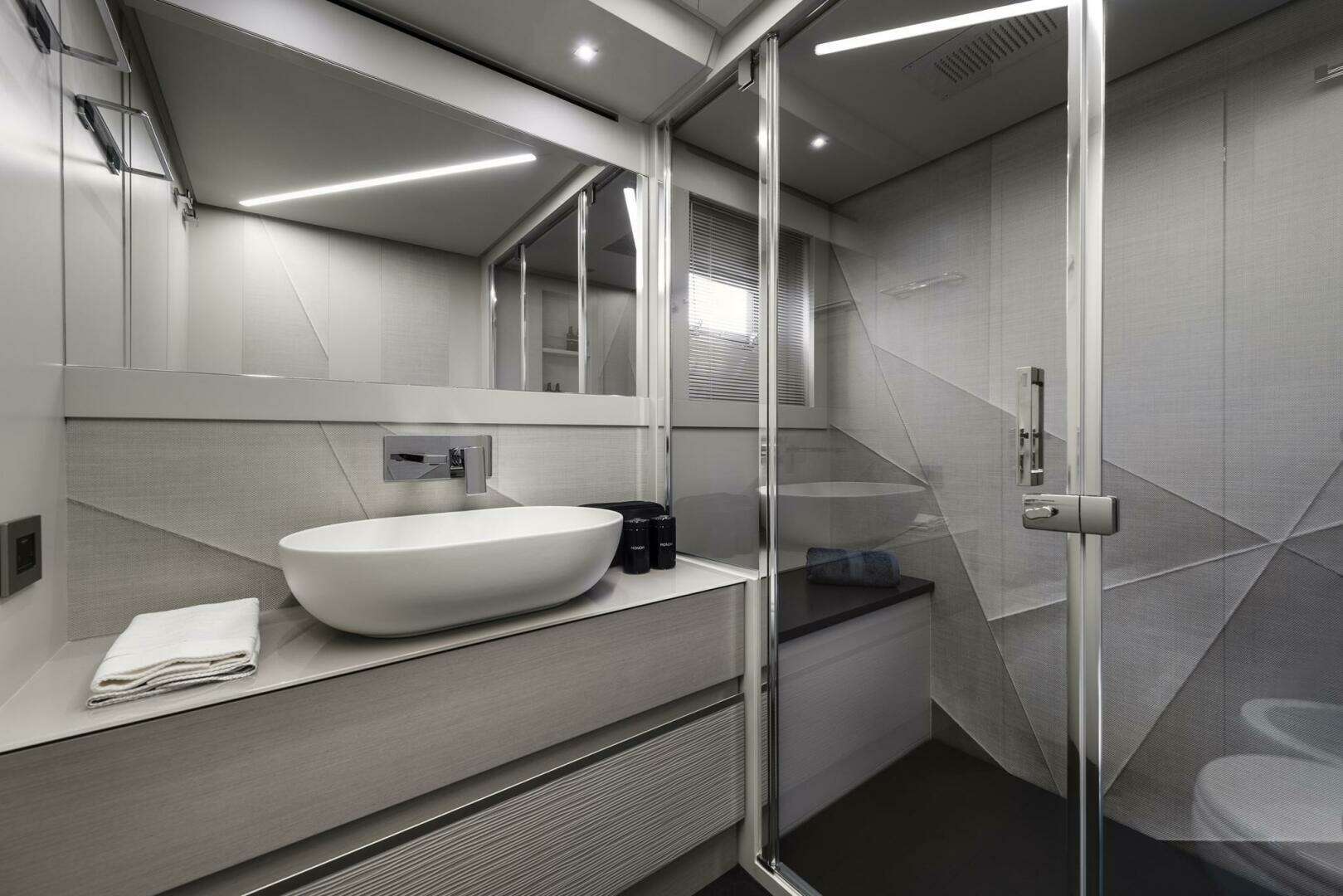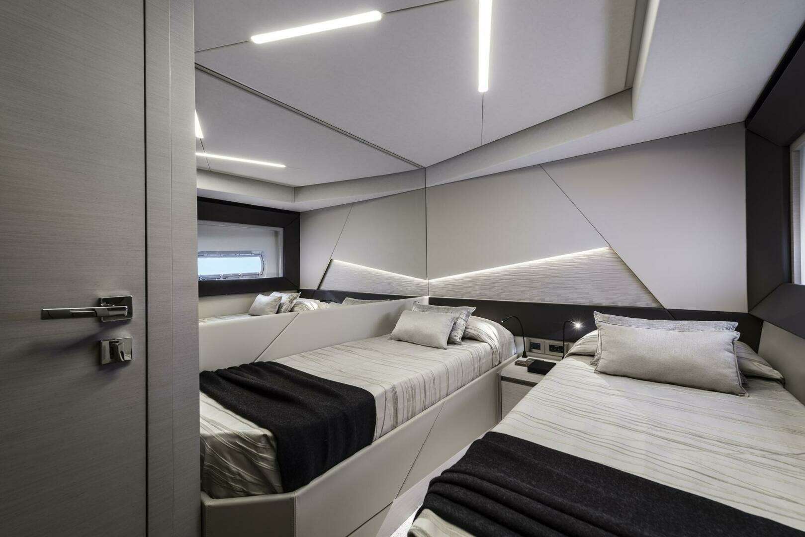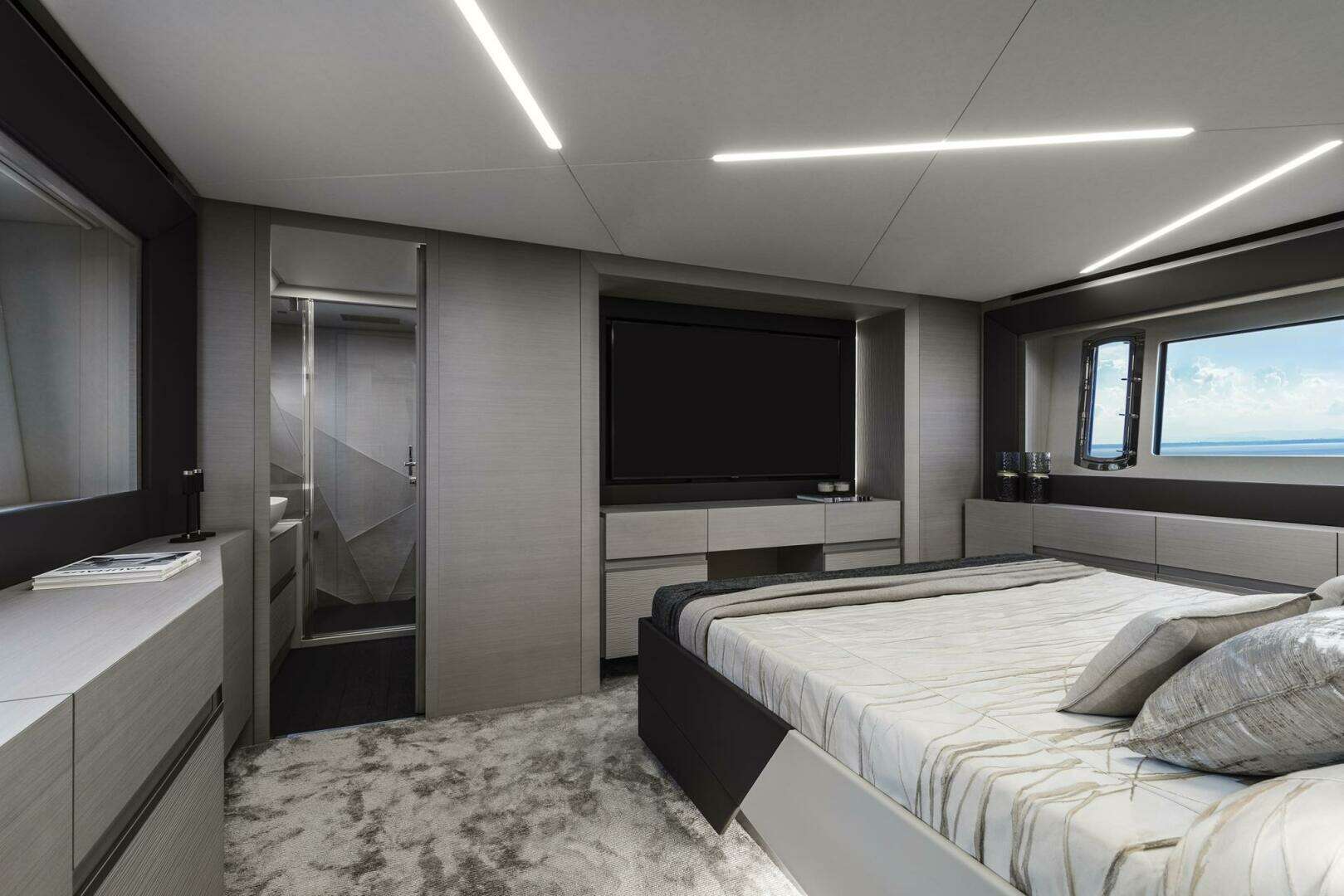 The spatial ergonomics is maximal thanks to volumes that blend technology and performance in perfect proportions. The open spaces allow the boat to be filled with pleasure and light, such as the large lounge characterized by the front openable windows and the dark glass sliding roof. The new, much larger rectangular portholes allow air and natural light to permeate the rooms below decks.