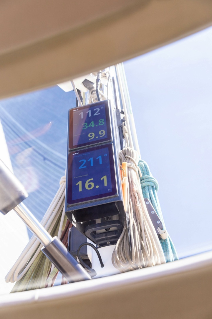 This IMX70 is fitted with a carbon fibre furling boom, a carbon fibre mast, hydraulic systems and fingertip steering, with all necessary controls and