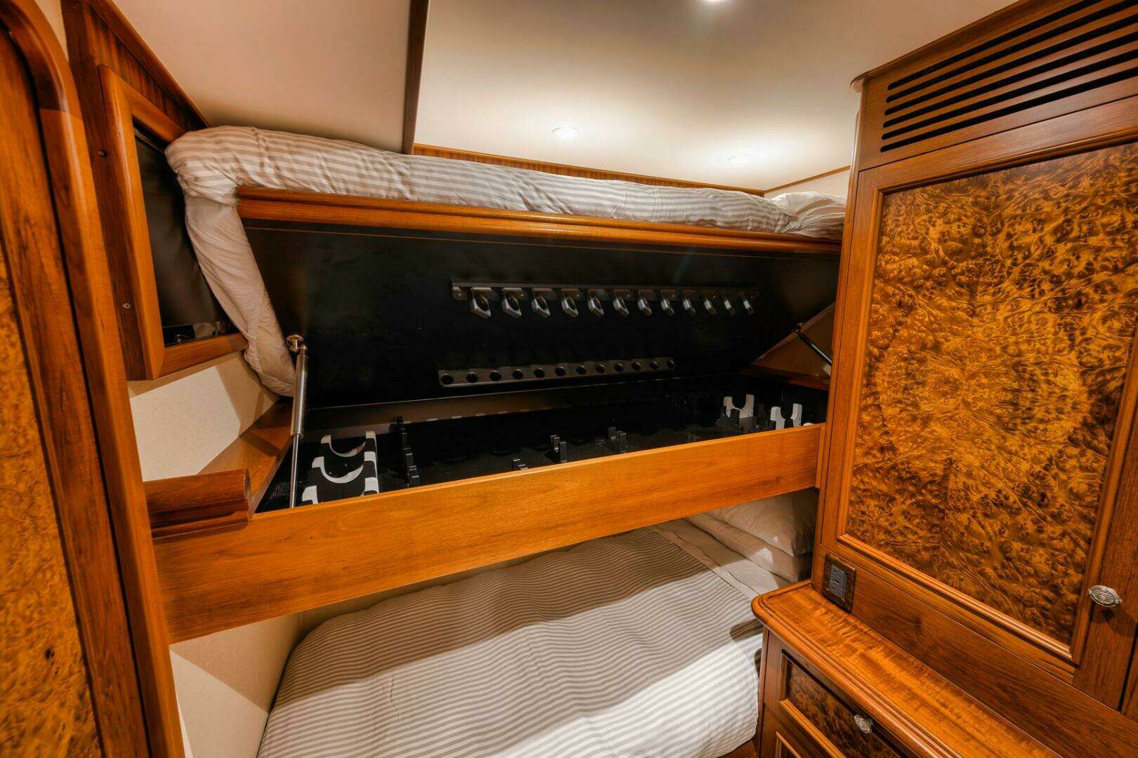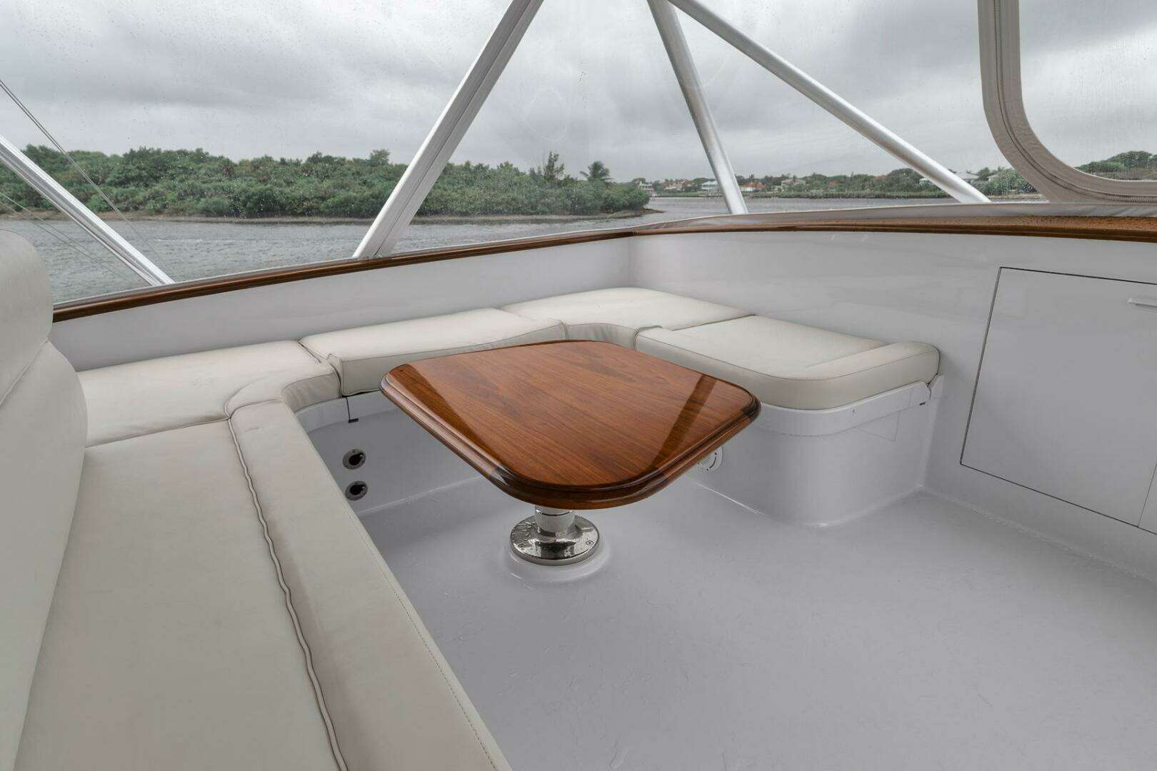 The mezzanine is a standout feature, combining luxury and functionality to enhance both the fishing experience and guest comfort. Positioned just above the cockpit, it provides an excellent vantage point for watching the spread or relaxing in the shade while underway. Cushioned seating with plush upholstery invites guests to lounge in comfort, and the space is thoughtfully designed with over head AC, drink boxes, and tackle drawers within easy reach—keeping everything organized and accessible without ever stepping foot into the salon.