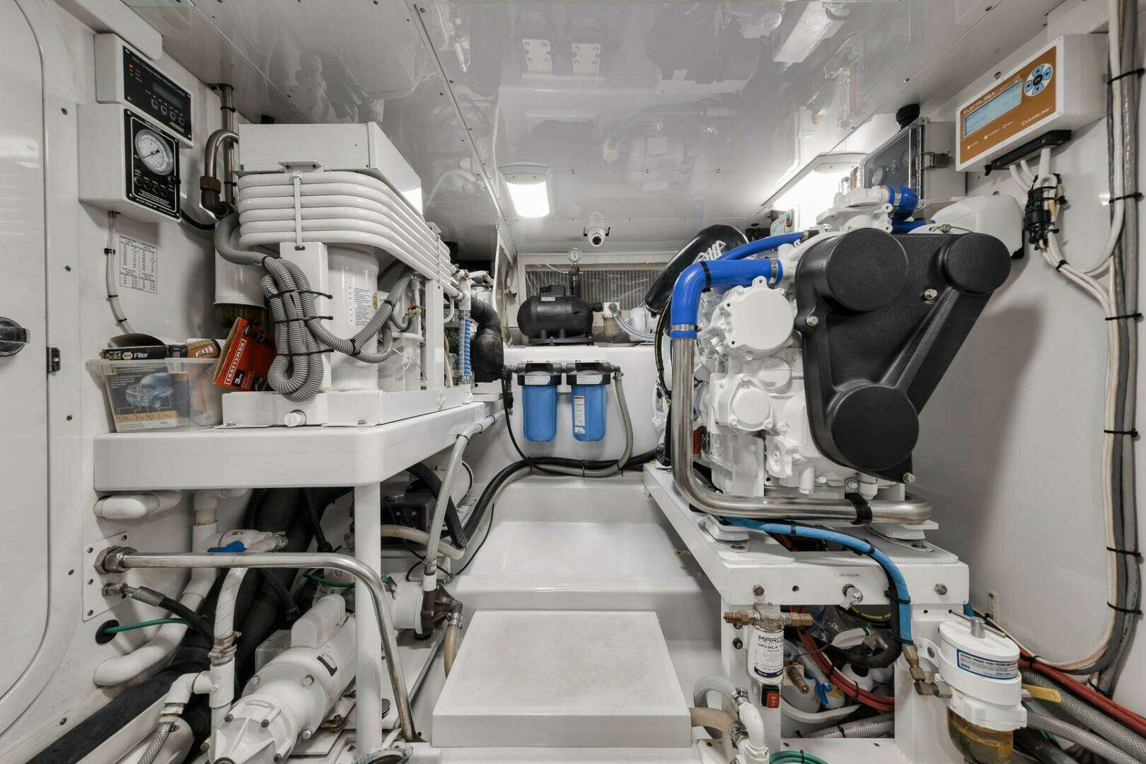 The engine room of the 71’ Jim Smith is a testament to the builder’s commitment to performance, accessibility, and meticulous craftsmanship. Immaculately finished with high-gloss white surfaces and excellent lighting, the space is both visually impressive and highly functional—designed with ease of maintenance and reliability in mind.