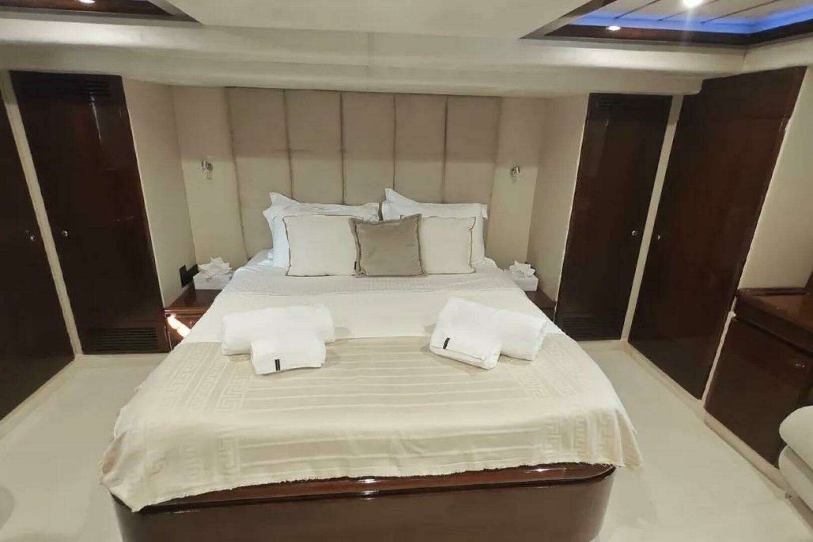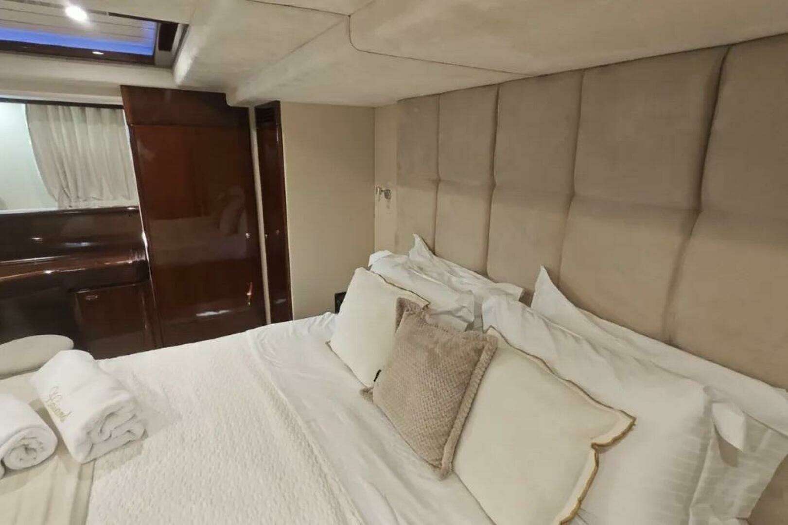 - Spacious and tastefully designed, the interior offers a full-beam master cabin, a forward VIP cabin, and two twin cabins, each with private heads. Separate crew access ensures guest privacy.