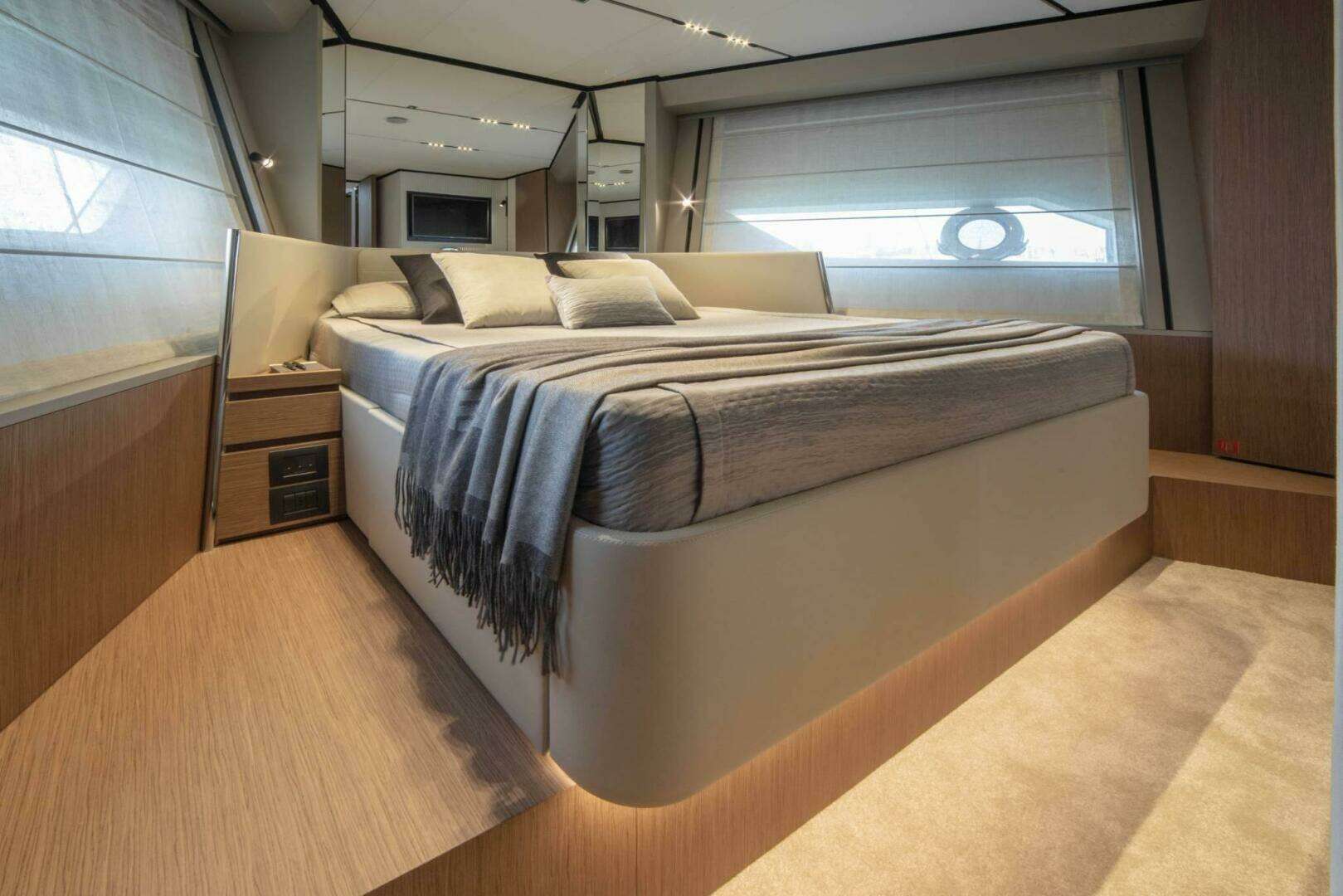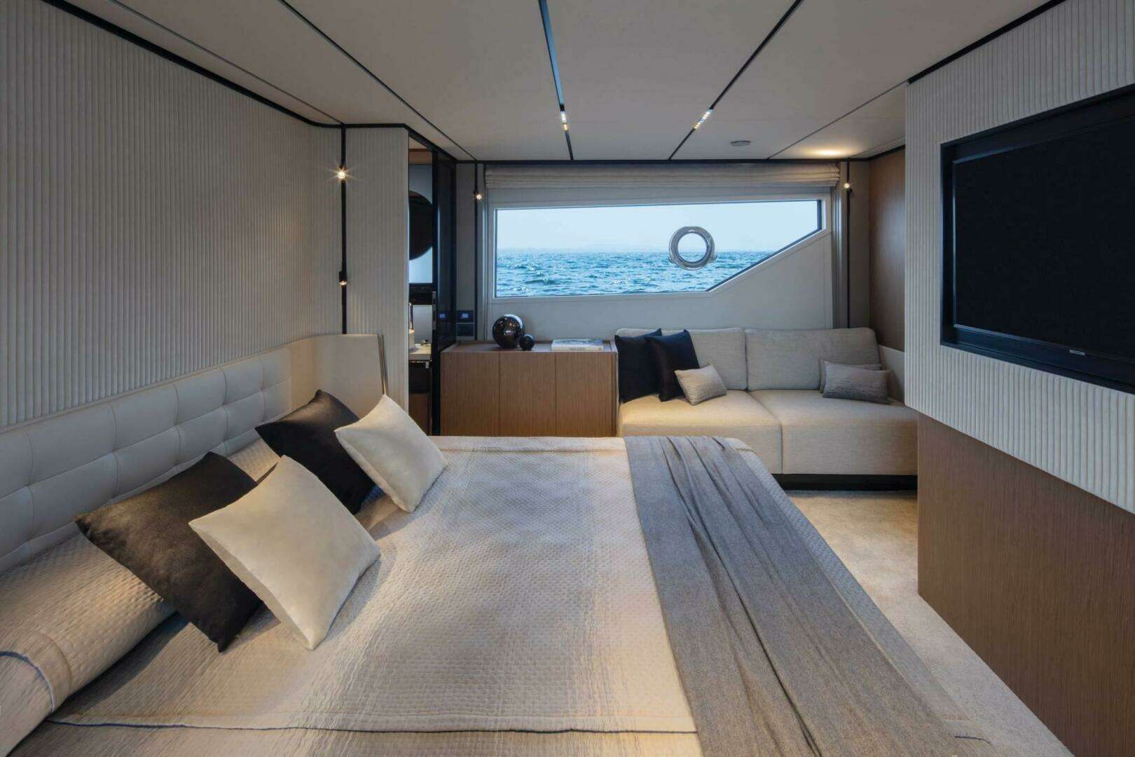 The Ferretti Yachts 720 debuted at the 2019 Cannes Yachting Festival and caused an immediate stir. With her amazing spaces, unexpected headroom and abundance of areas to enjoy, she takes the cruising experience to a new level. She is the fruit of a partnership between our Product Strategy Committee and the Engineering department – the second yacht with external design by Salvetti and Ferretti Group, with interiors by our own architects and designers. The spacious master cabin echoes the play of colors and materials that grace the main deck, in a peerless private setting that’s a joy to discover.