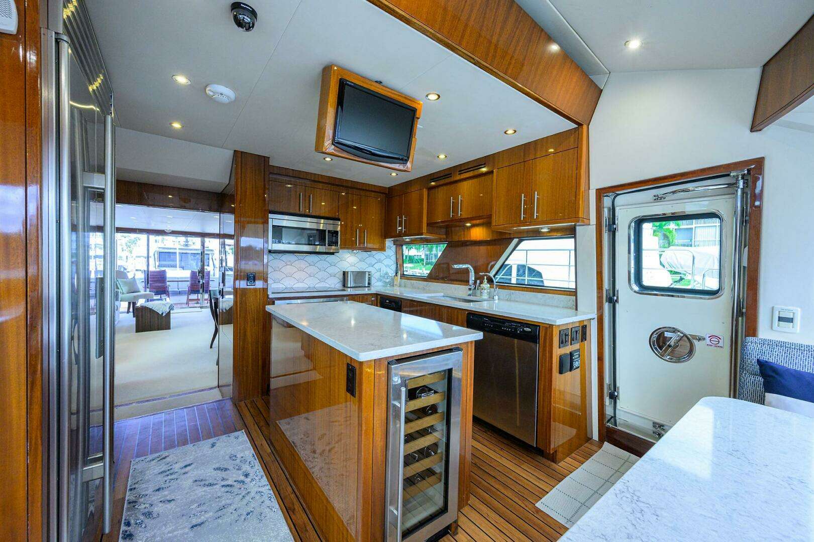 The galley is forward and one step up. The sole is an Amtico plank. Ten large windows offer plenty of ambient lighting. A center island with four drawers, a SubZero glass front wine cooler, and a Light stone top greatly increases the workspace.