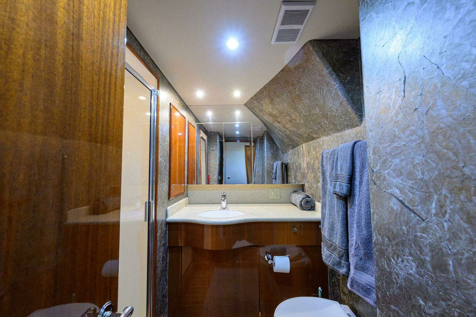 The high gloss mahogany vanity has LED strip lights and one drawer below and a Corian countertop and sink above. A three-shelf linen locker and two mirrored medicine cabinet doors are above the sink. The toilet is a Headhunter model. The stall shower has a clear glass door, a handheld or wall-mounted fixture, a light, and an exhaust fan. Also in the head are four overhead mini spots and an A/C vent. The sole is Amtico.