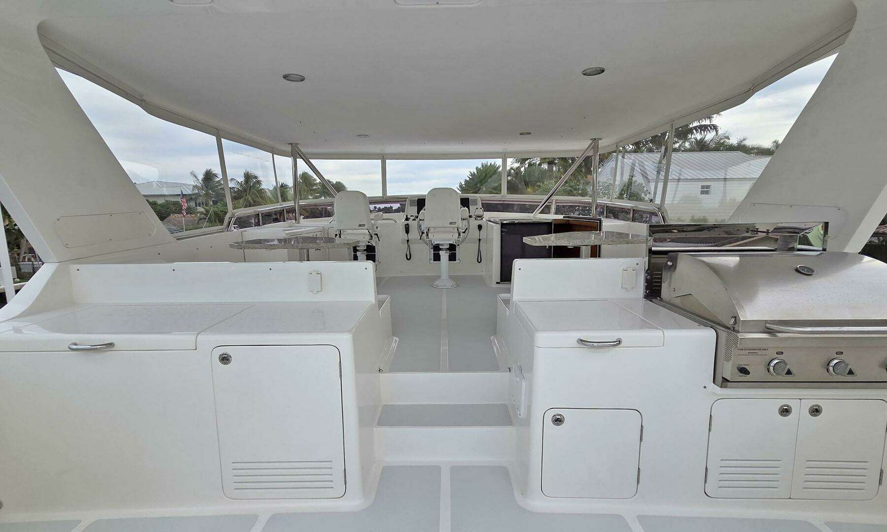 Moving aft and down a couple of steps to starboard is a very large stainless grill and sink and to port, a refrigerator, and large opening storage compartment.
