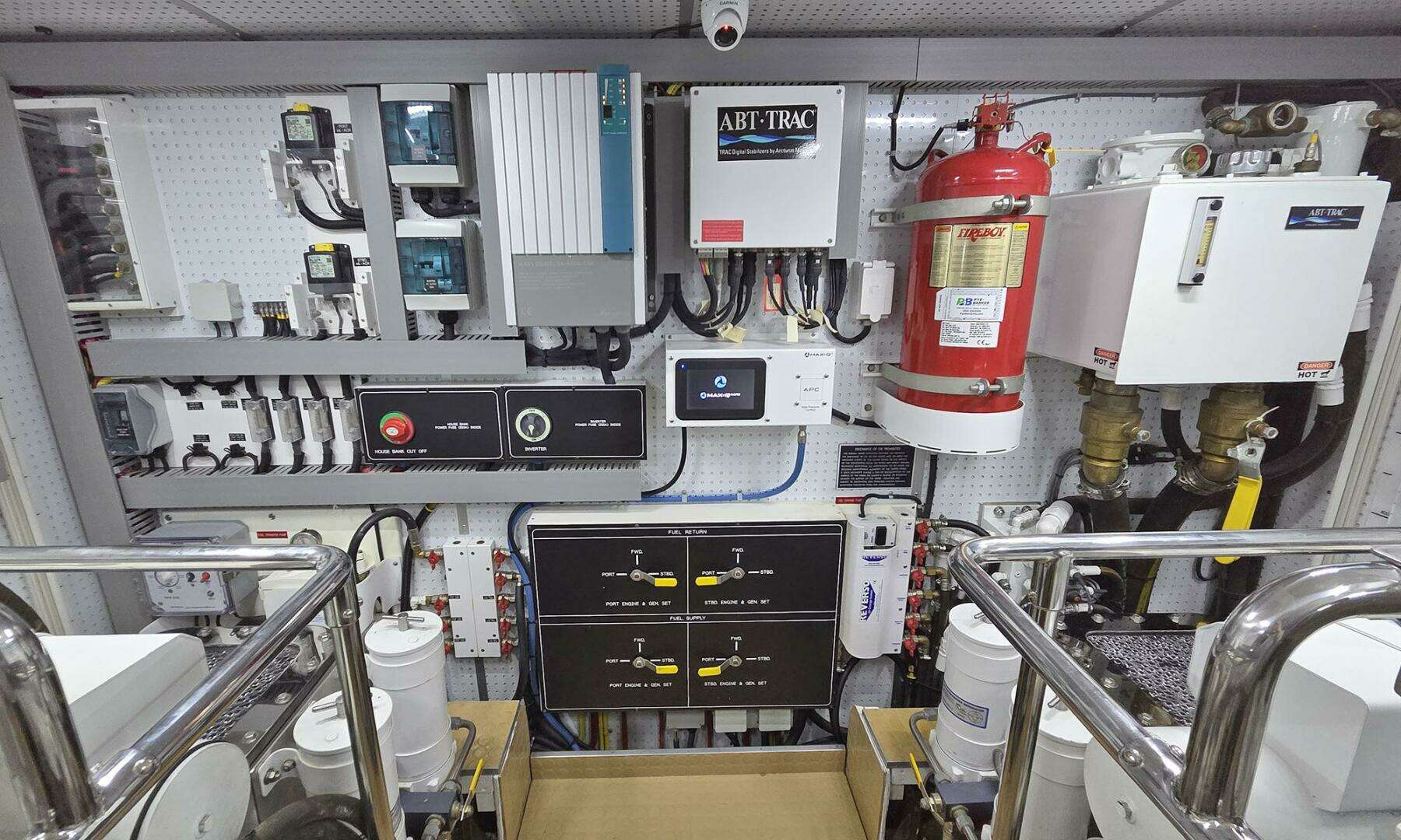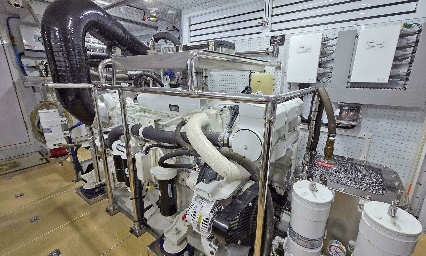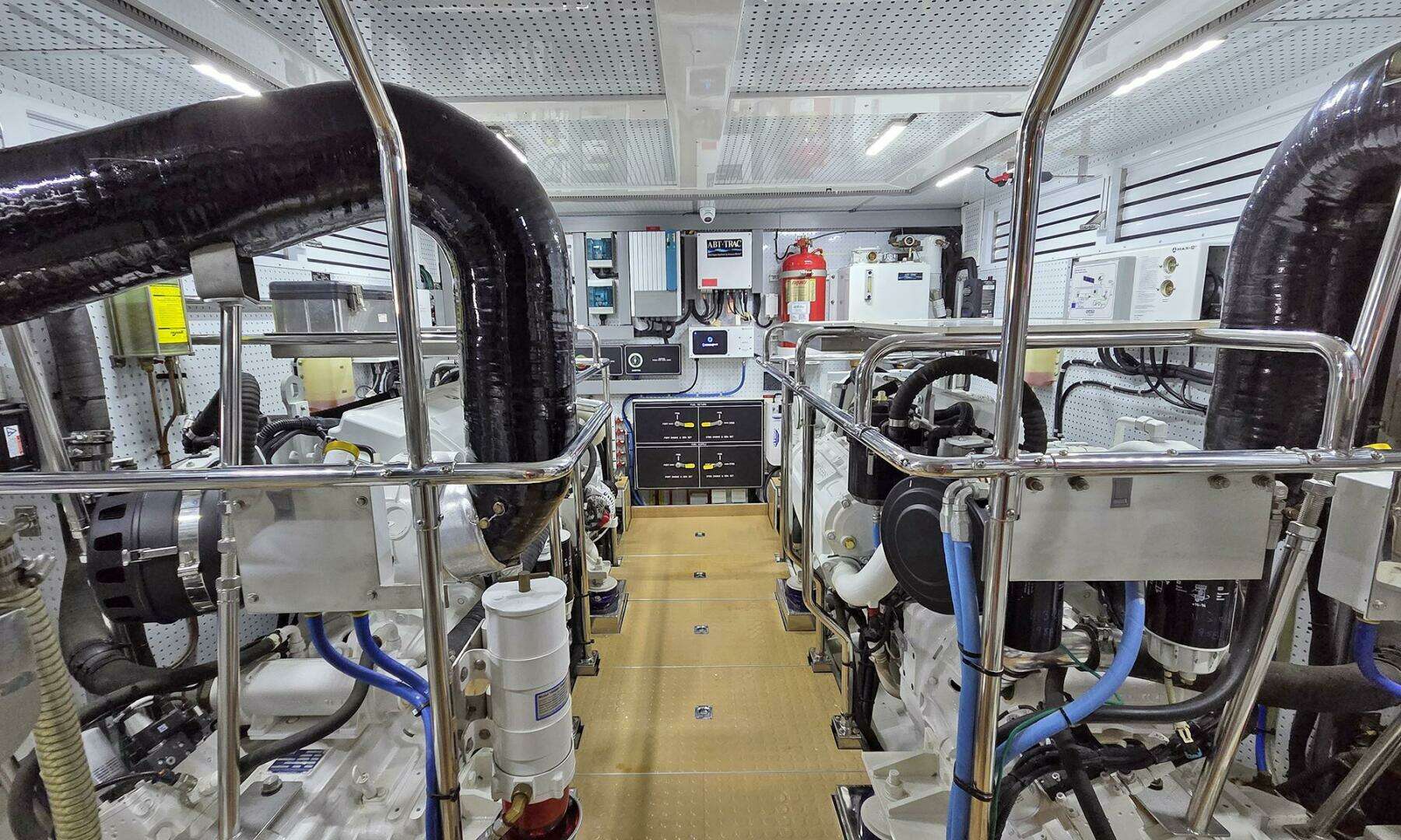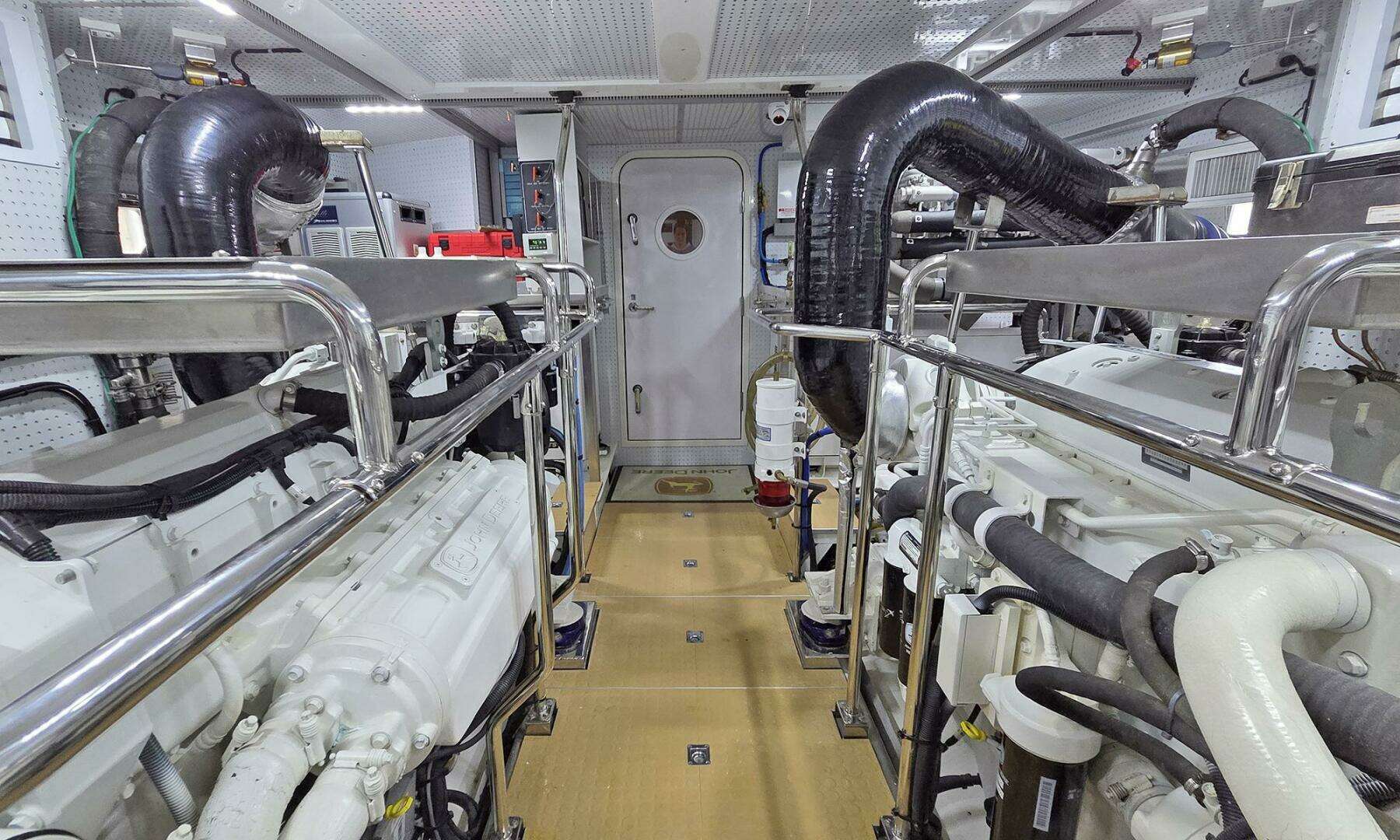 The engine room is accessed through a watertight door which houses the twin John Deere 750 hp engines, twin 20 kW Northern lights generators, and much of the yacht’s systems, including the watermaker, frequency and voltage converter, plus fuel tanks outboard. This is also an air-conditioned area and the twin chiller redundant system is located in the engine room, as is the enclosed shaft Seatorque system.