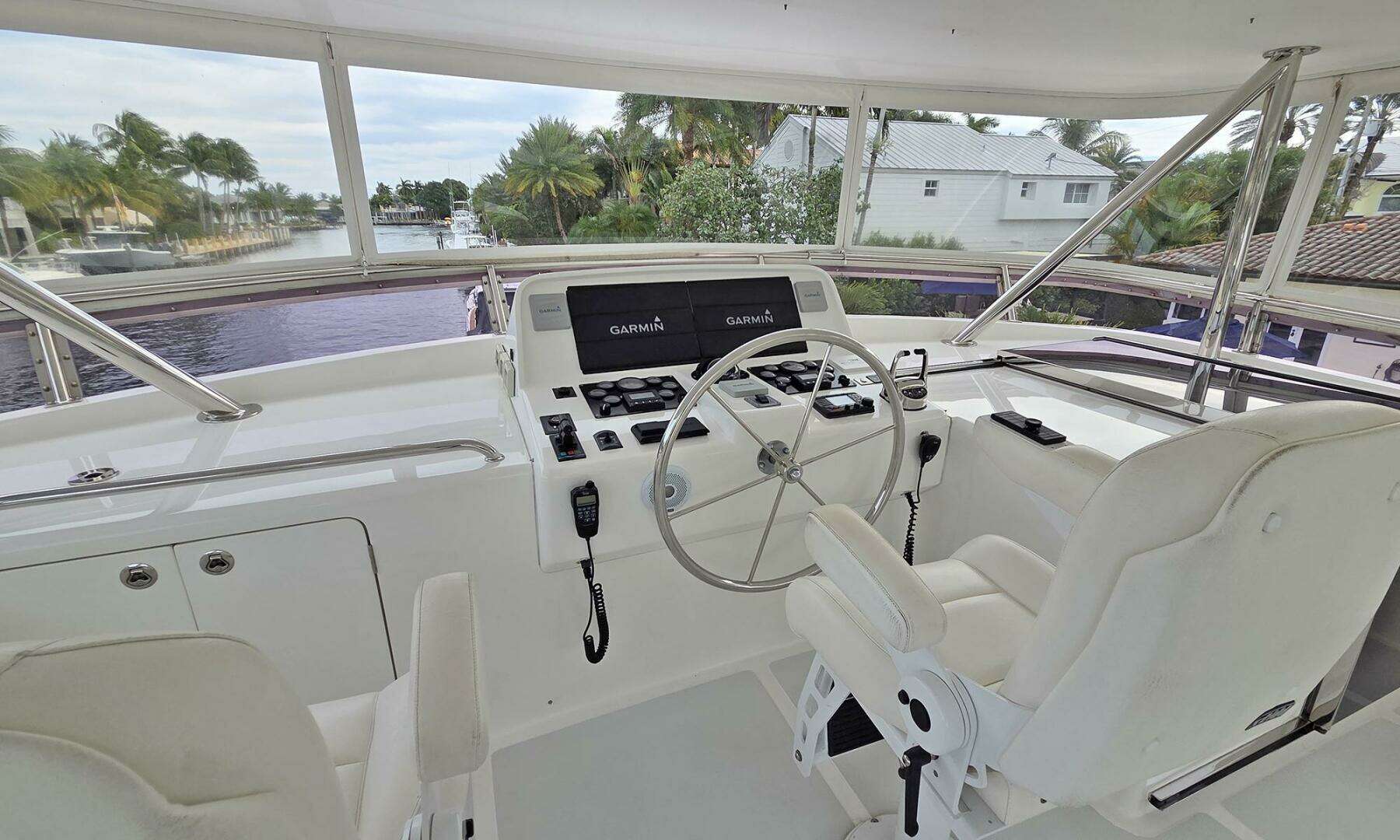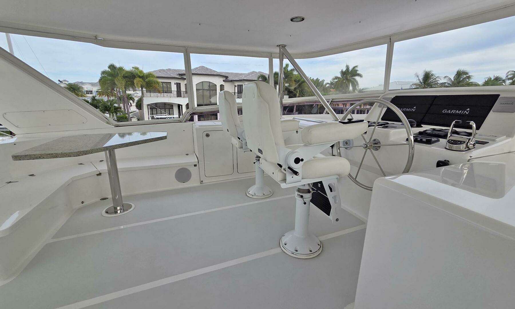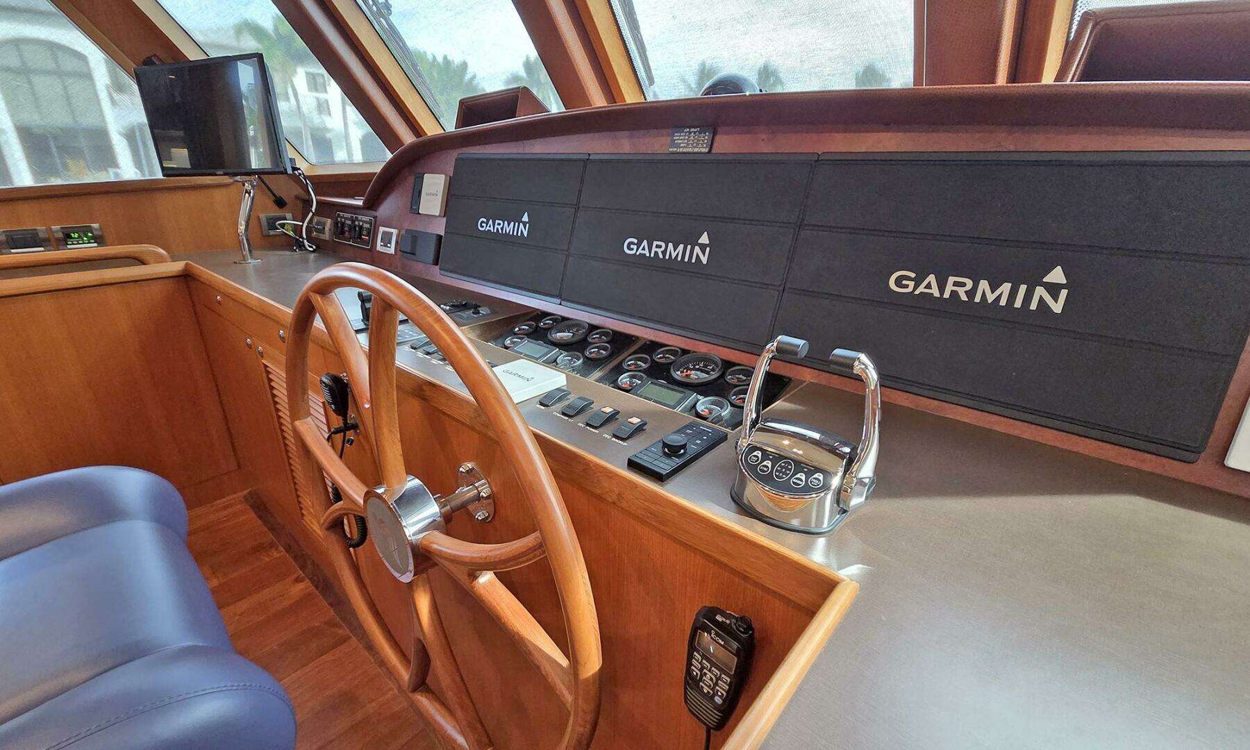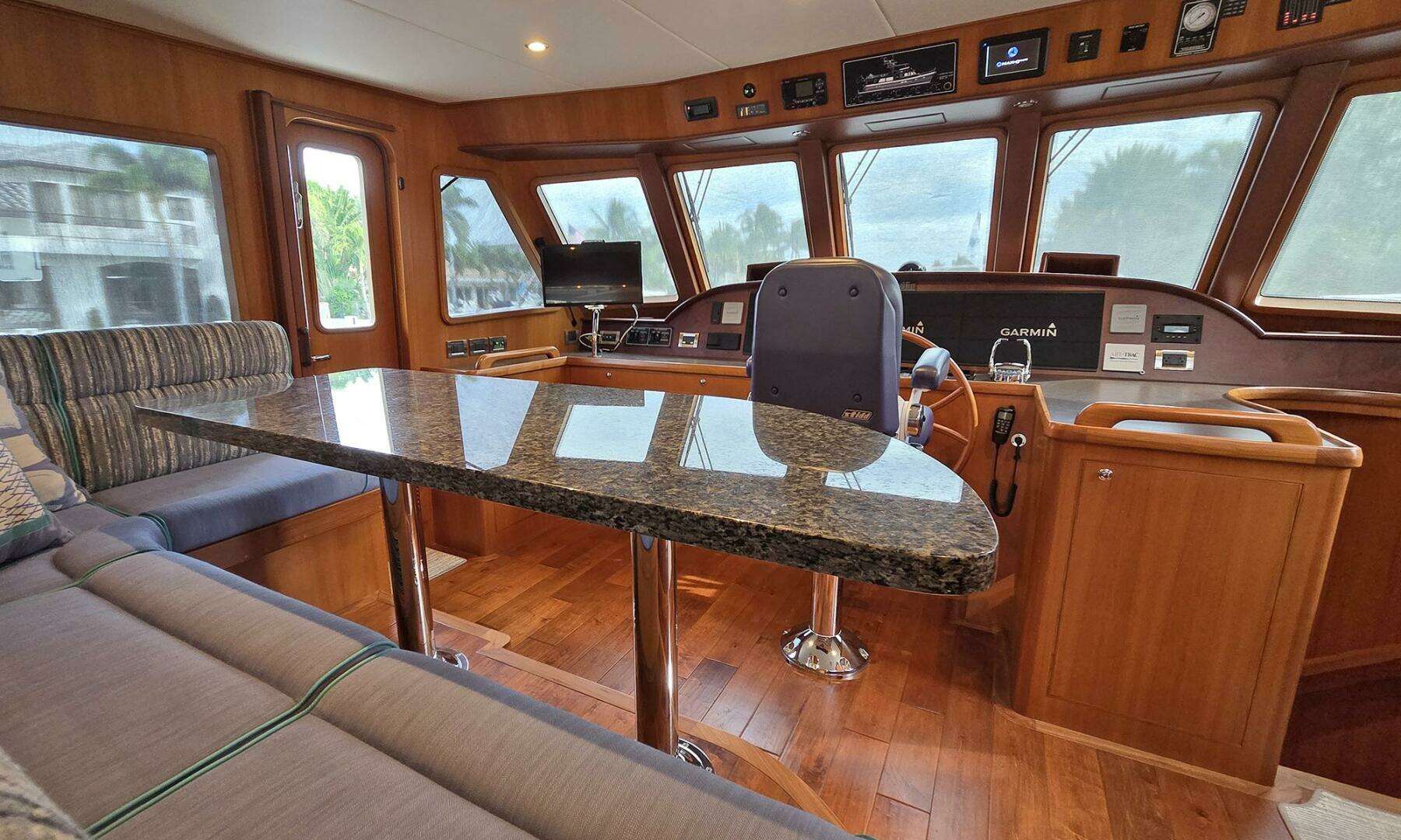 This yacht has the open layout, which is the most desirable, but in addition, there is a raising panel attached to the aft area of the L shaped seating in the pilothouse, that can offer separation for nighttime travel or allowing a more private conversation or workspace separating it from the salon area and galley. Additionally, there is substantial storage under the L-shaped seating in the pilothouse and a granite table for dining. To starboard, this yacht has a wider, more comfortable staircase than previous sister ships built to allow easy access to the flybridge the center position Stidd helm seating, allowing for great visibility, forward and aft. The electronics and other systems chosen were the result of both additional research and due diligence - allowing a couple to handle the vessel with complete confidence, both underway, and when docking the yacht.