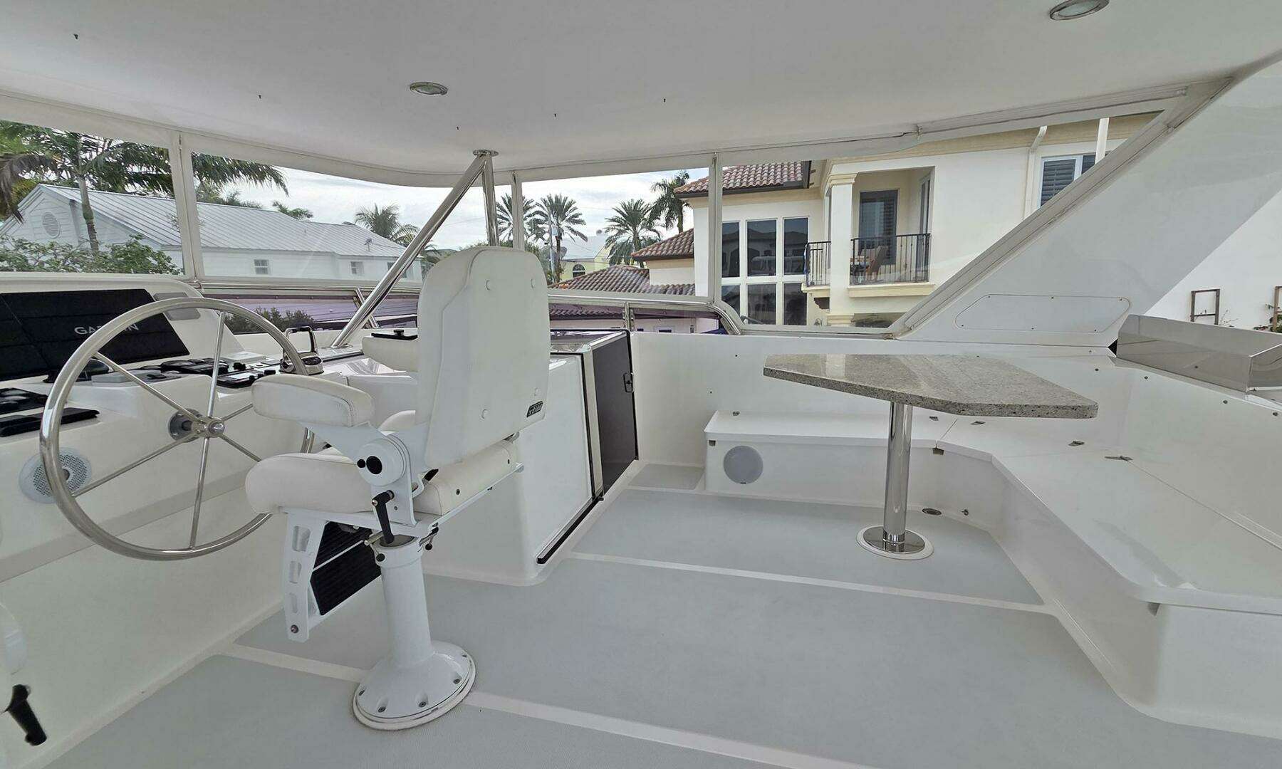 The wide comfortable staircase from the pilothouse leads to perhaps the largest flybridge on a 72 foot yacht. The hard top over the forward section was designed to allow the three-sided enclosure below to maximize visibility. The upper flybridge console contains duplicate systems seen below in the Pilothouse such as the fully hydraulic proportional, bow and stern thrusters, and stabilizer system controls. There are Stidd seats, a continuation of the gray non-skid seen below on the main deck, port, and starboard, U-shaped, seating with granite tables and storage below the seating. There is also an added feature next to the helm chairs - an additional storage cabinet with lounge above.