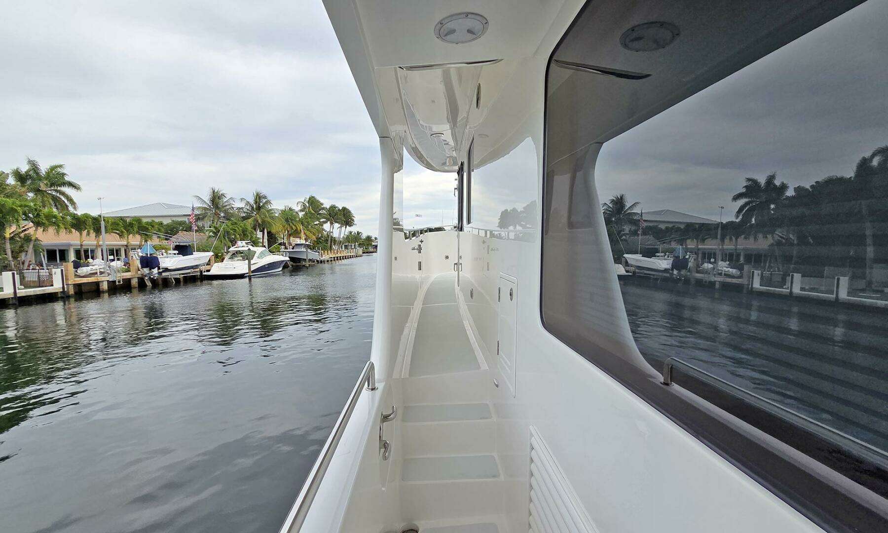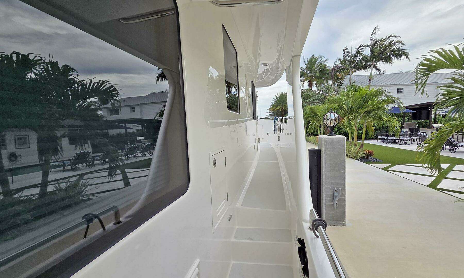 The aft deck features a comfortable staircase to the flybridge, boat deck, the optional teak decking, wing doors, a custom cabinet which includes refrigeration and storage, built-in seating, and a beautiful teak table, and four deck chairs to allow for comfortable alfresco dining. In addition, a custom designed premium stainless steel and glass exterior door and window were carefully chosen, and the window can raise and lower; in the lowered position, the large flatscreen TV can rotate 180° to for viewing from the aft deck seating, greatly complimenting the alfresco lifestyle.