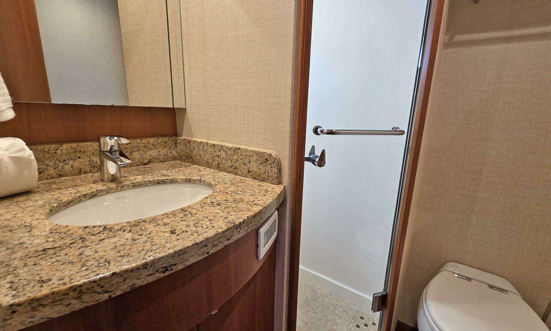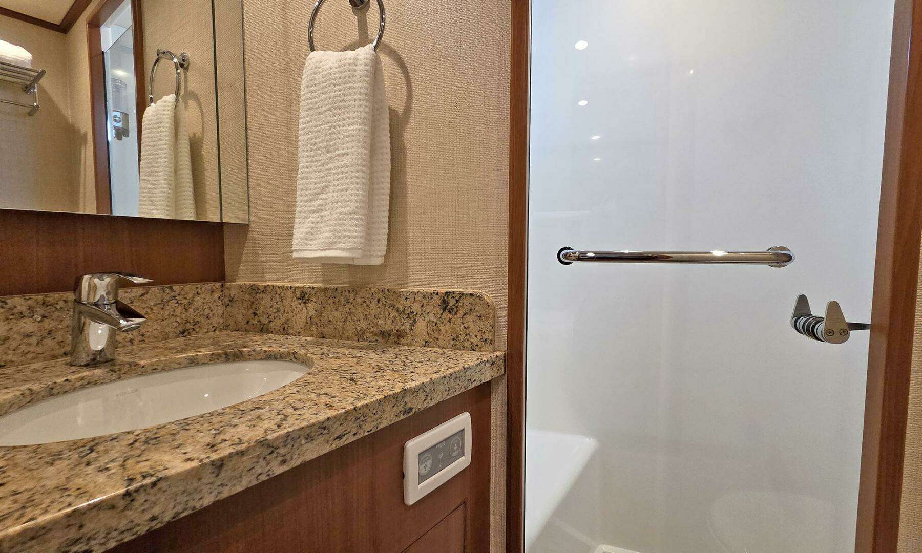 The detail of choices in this stateroom includes a separate, standalone air conditioning system run from the inverter, and a doubled sized house batteries bank to allow the master area when at anchor to have complete comfort without a generator running. Also, an additional GPS monitor provides information including an anchor watch system. The en suite head has a marble countertop, and the large shower, like the other showers on board, has a mosaic tumbled marble floor.
