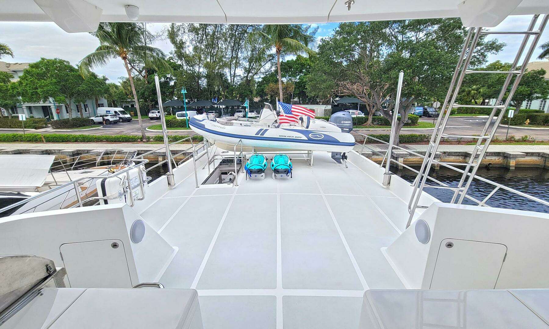 Continuing aft on the flybridge deck, the boat deck houses a 2020 Walker Bay Venture 14 foot tender with 70 hp Yamaha on removable raised chocks. This area also has an abundance of water toys including two kayaks with mounting brackets and two SEABOBs. The 1,700-pound davit is fully hydraulic and has a 12-foot telescopic arm to allow the tender and other water toys to be brought down behind the extended swim platform or to the side of the vessel. There are also two stainless posts that allow a sunshade from the rear part of the hardtop to the top of the stainless posts for sun protection. There is also easy access from the boat deck area by opening a sliding glass hatch and heading down the staircase to the aft deck.