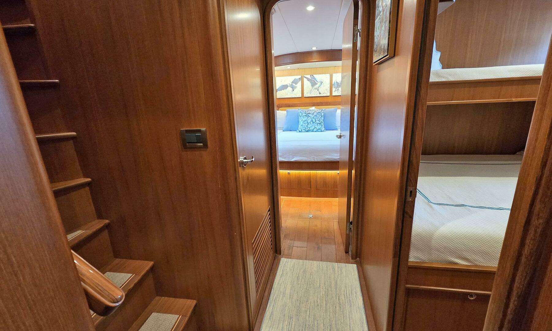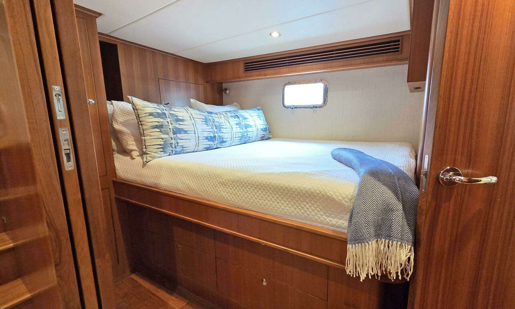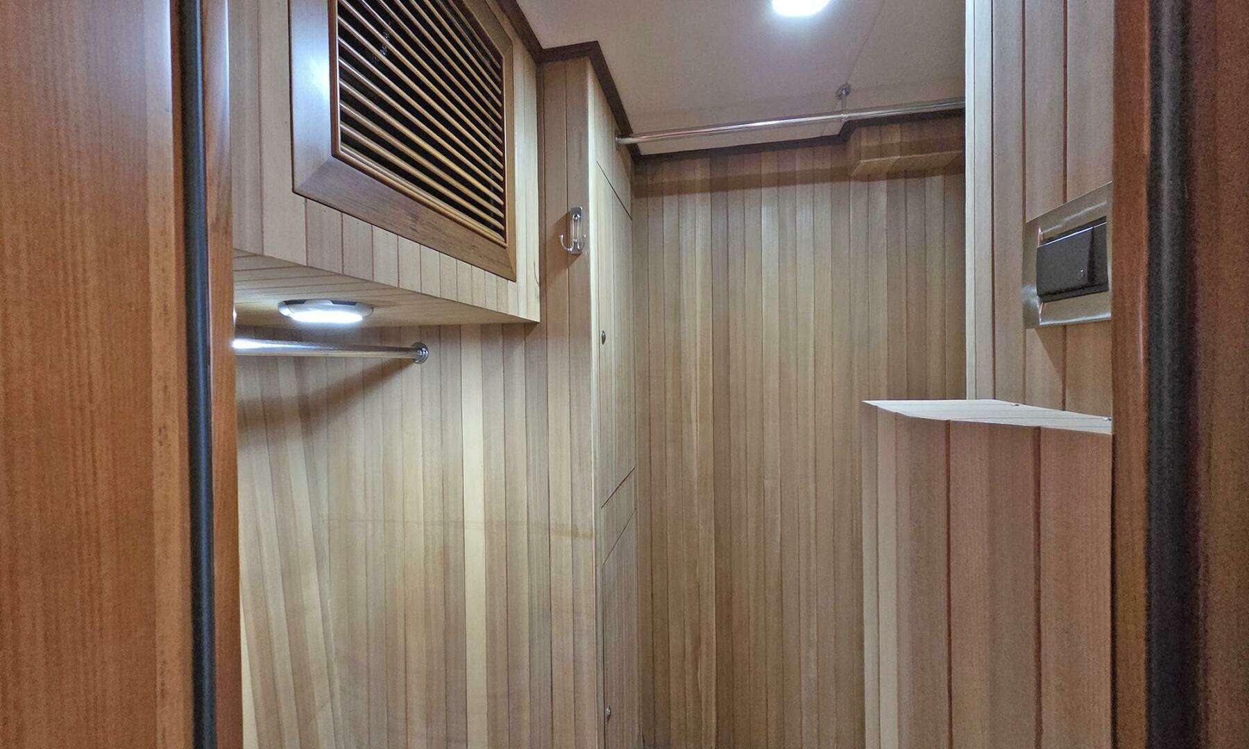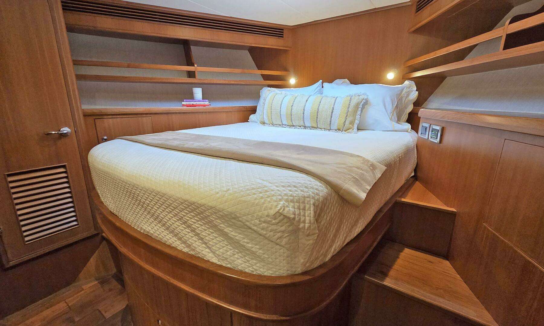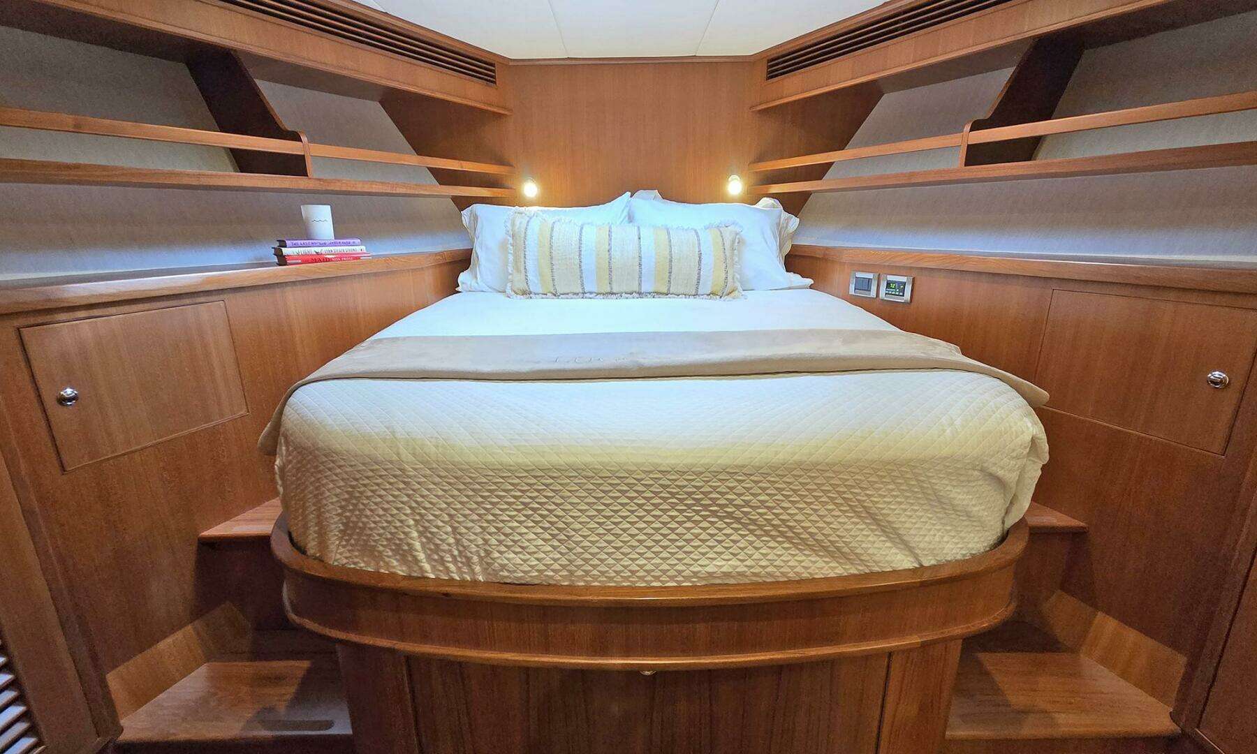 A comfortable well-designed staircase from the pilothouse leads to the owner and guest accommodations below. Forward is the VIP with a queen berth forward, with additional bookcase storage and cedar lined hanging lockers, plus a private, ensuite head and shower.