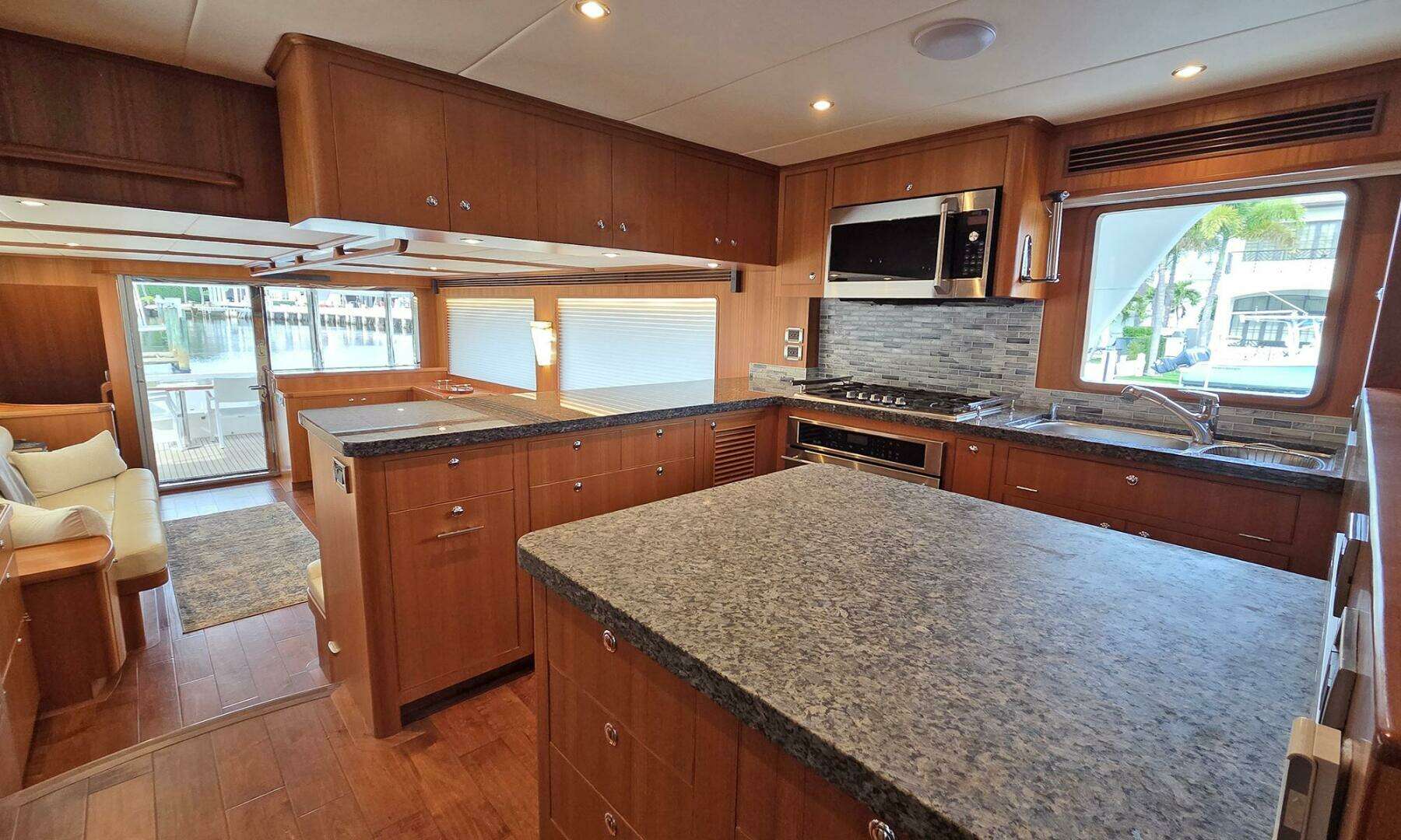 Moving forward, and up two steps from the salon there is a well-appointed on deck head, and large refrigerator freezer. Granite counters, house appliances, such as an LP stove top and oven below, microwave, dishwasher, and wine cooler. The granite topped island in the galley has very substantial storage with large drawers.