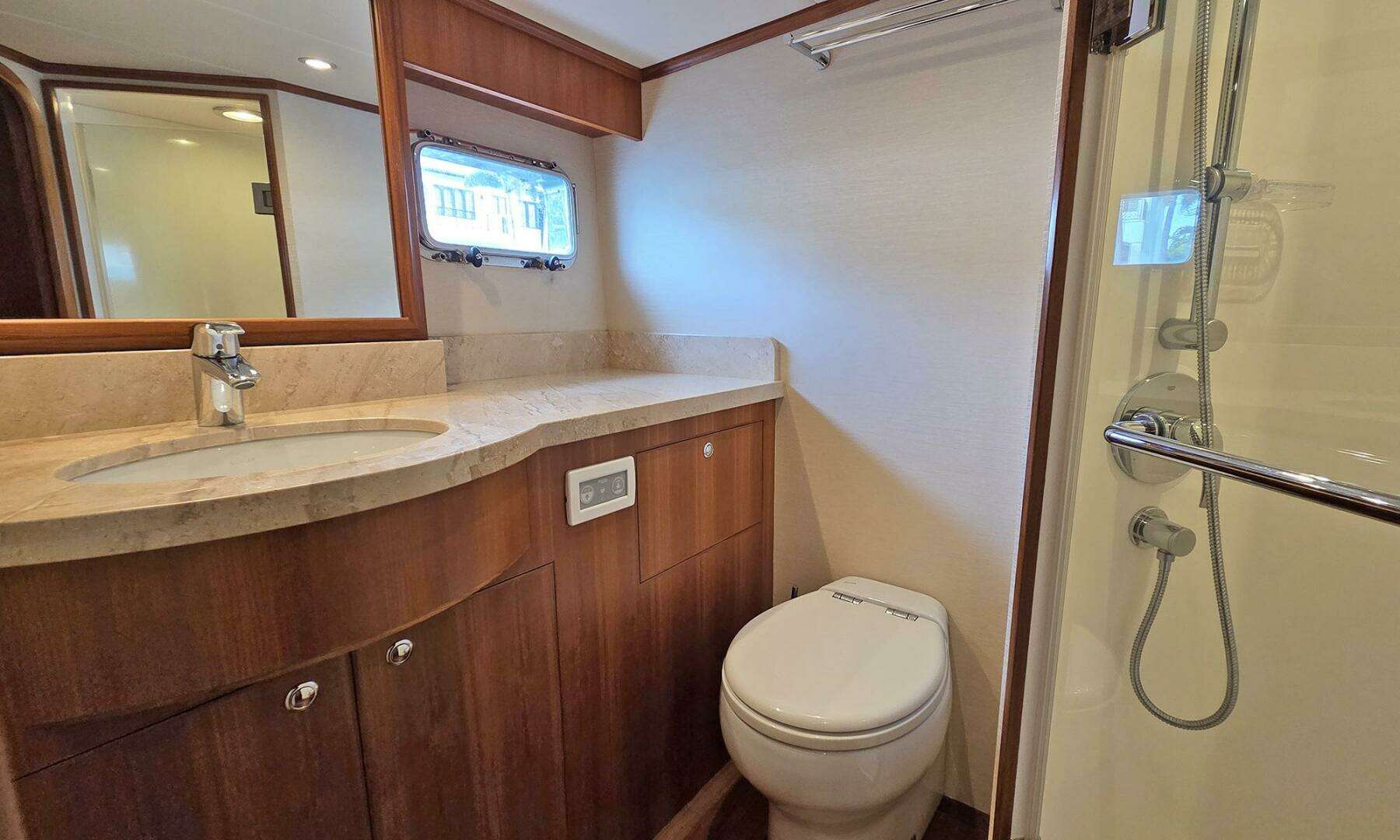 Moving aft from the VIP to port, the state room provides a full queen size berth below, and single pullman above, cedar lined hanging locker, drawer storage and large, en-suite head and shower.