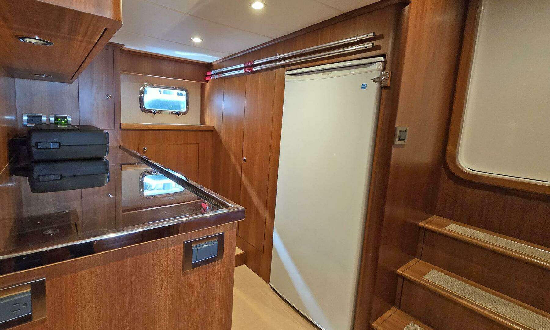 Continuing with the interior, the rear staircase from the salon leads down to the lower accommodation, and as you reach the bottom of that stair case, there is the second separate washer and dryer. At the bottom of the staircase, there is a door to reduce the sound travel area up to the salon to starboard, and moving aft is a stainless steel, topped workbench area, built in trash compactor, toolbox, storage above the workbench for the raft, and a full-size freezer. Centerline are three steps up to the watertight door that leads out to the swim platform area. To port there is a double berth cabin, with full en-suite head and shower, to be utilized either as a fourth family or guest cabin or crew cabin. Moving forward along the centerline walkway, there is a galleyette with refrigeration and storage below a granite counter with sink and built-in microwave above.