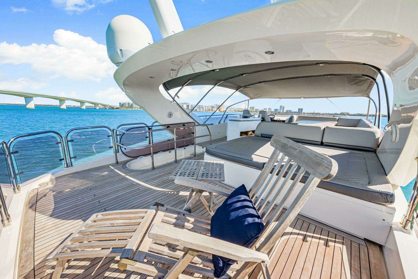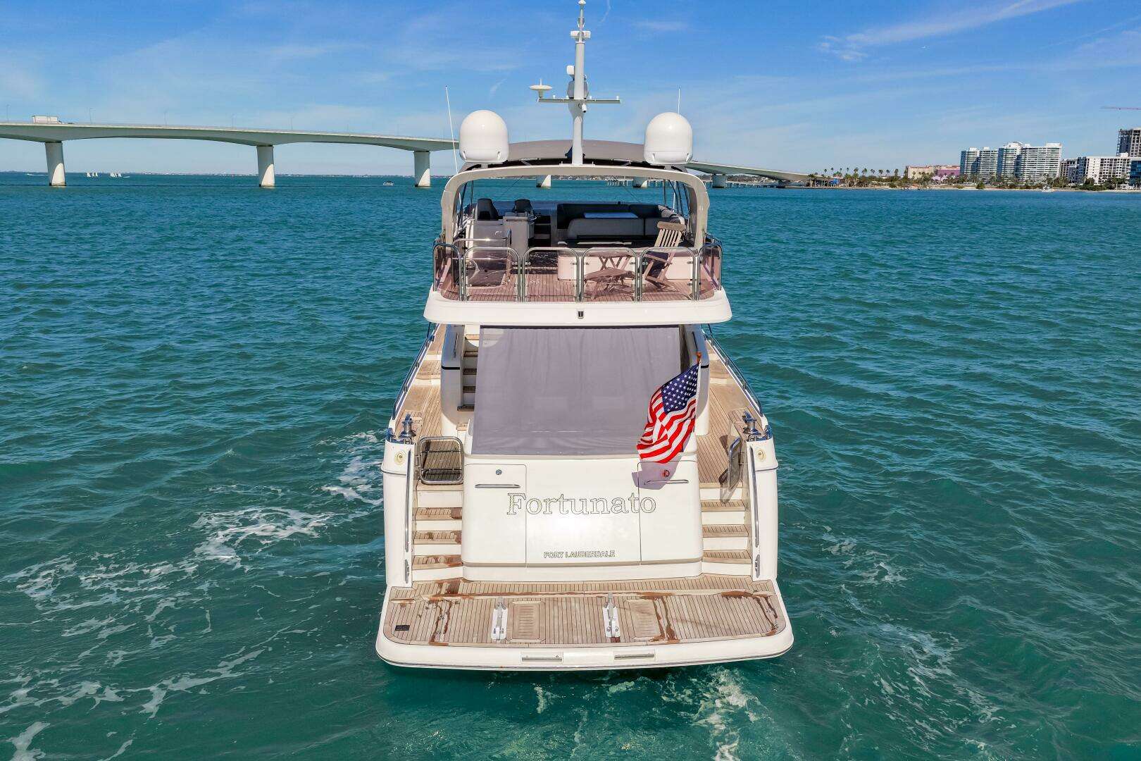 Fortunato has a luxurious interior design with upgraded TV and design features. Powered by the always reliable twin CATERPILLAR C32A 1622hp each, she sports new upholstery in 2020, new chillers in 2023, new covers and bimini (2025), new washer and dryer (2024), New refrigerator (2024), and all new much thicker teak decks installed in 2023 in Fort Lauderdale.