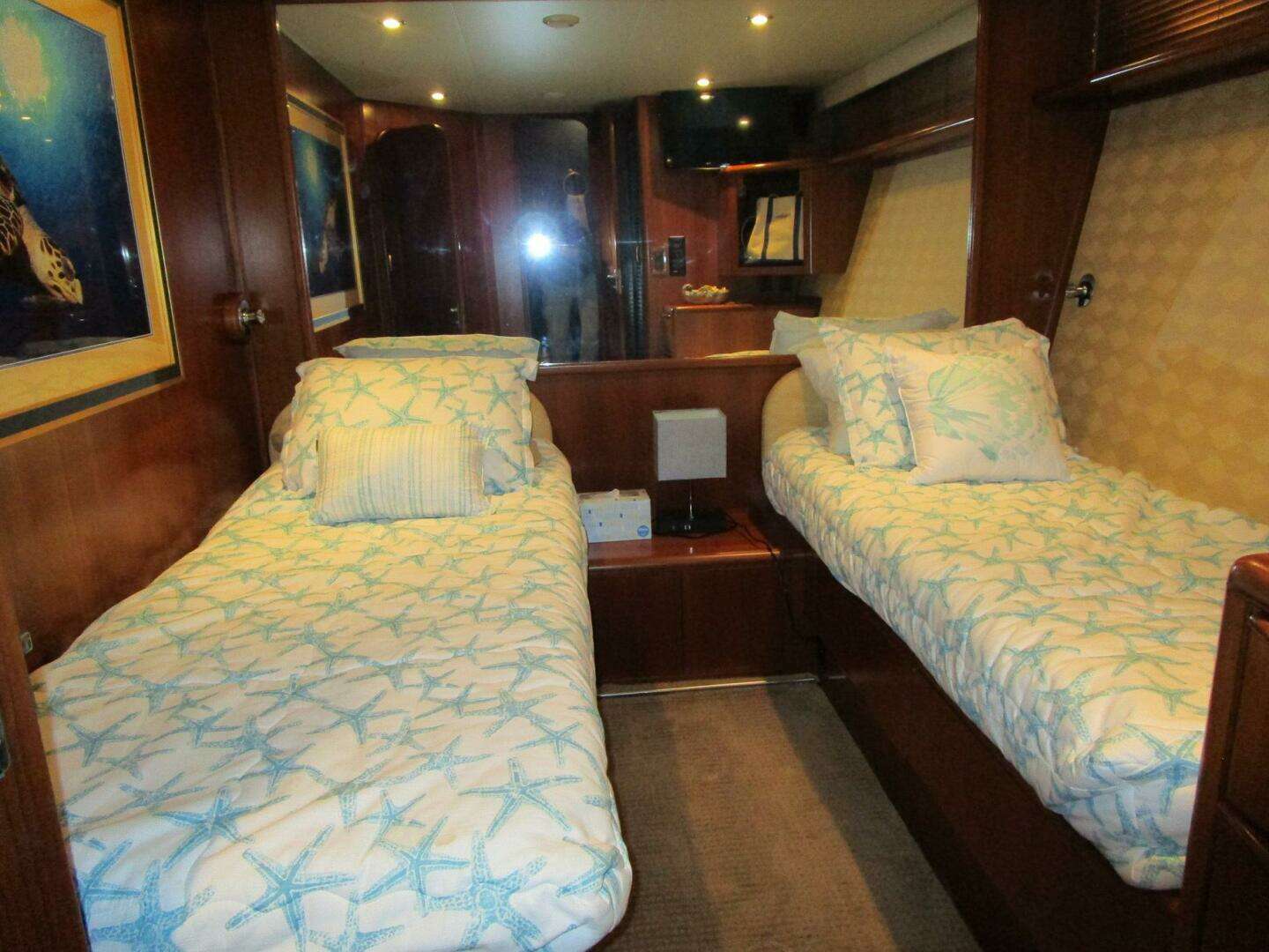 From the pilothouse steps to below are three additional cabins. Forward is the VIP with an island berth and a shared head. Aft to port is a twin lower berth cabin with access to the shared head. To starboard is an over/under berth cabin with a private head to be considered a crew cabin as needed.