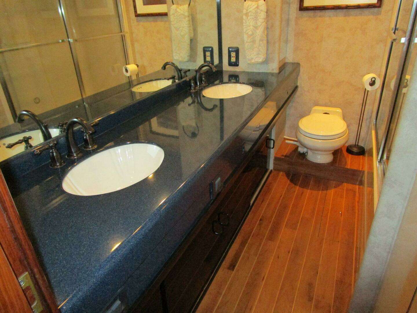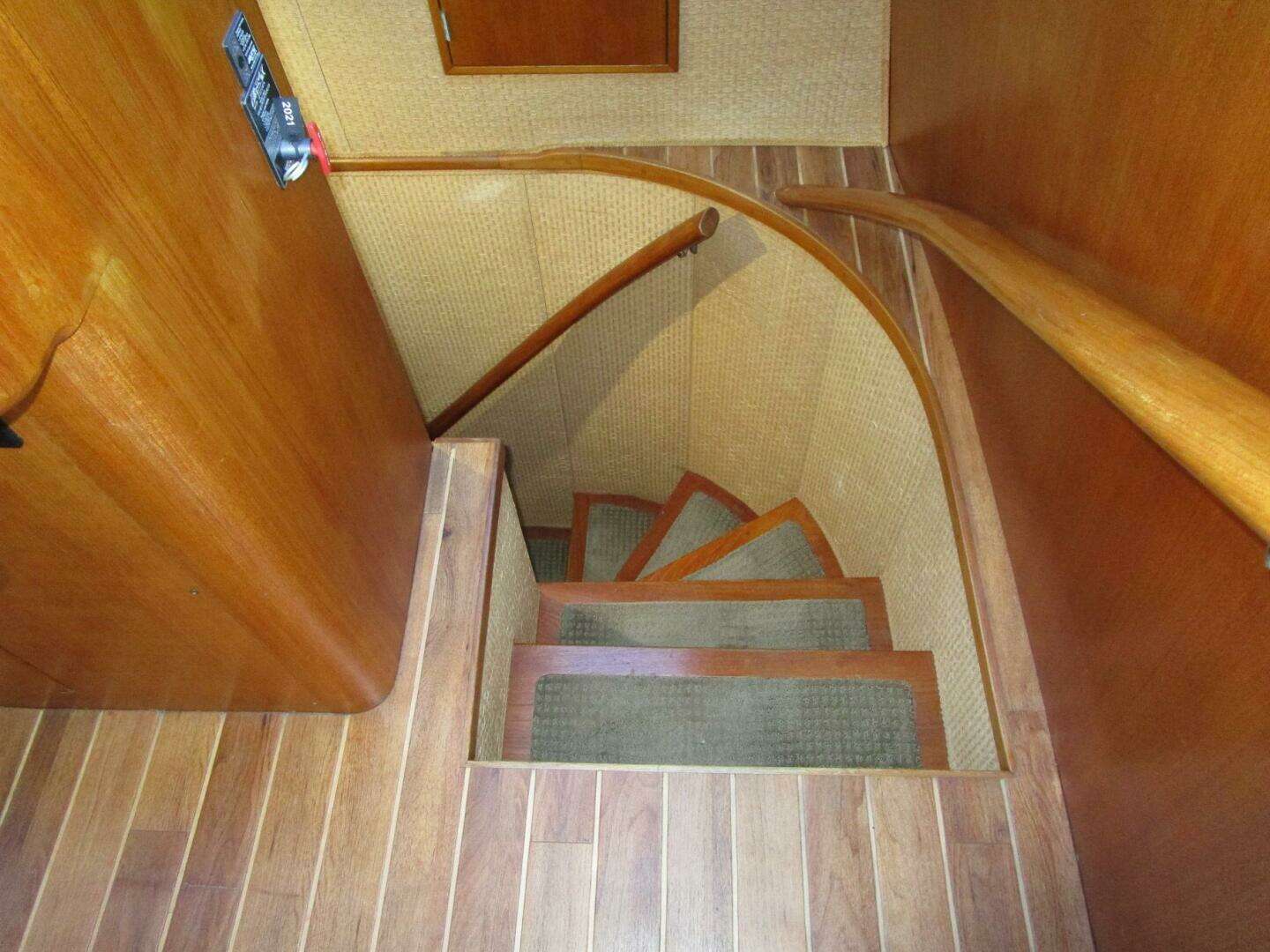Tucked under the stairs to the flybridge are carpeted steps to the private master suite, the laundry room and the engine room. The private master has a king size island berth, a huge amount of storage, including a walk-in hanging locker, vanity and a small settee. The large private head has two sinks and a jacuzzi tub/shower.