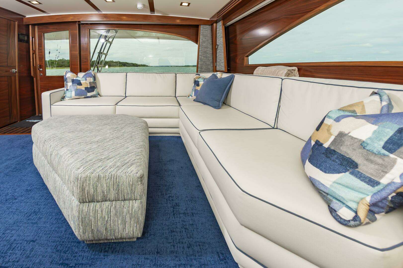 - Lounge seating to port and starboard and at forward end of helm console with vinyl covered foam cushions, hinged for access to storage under seats