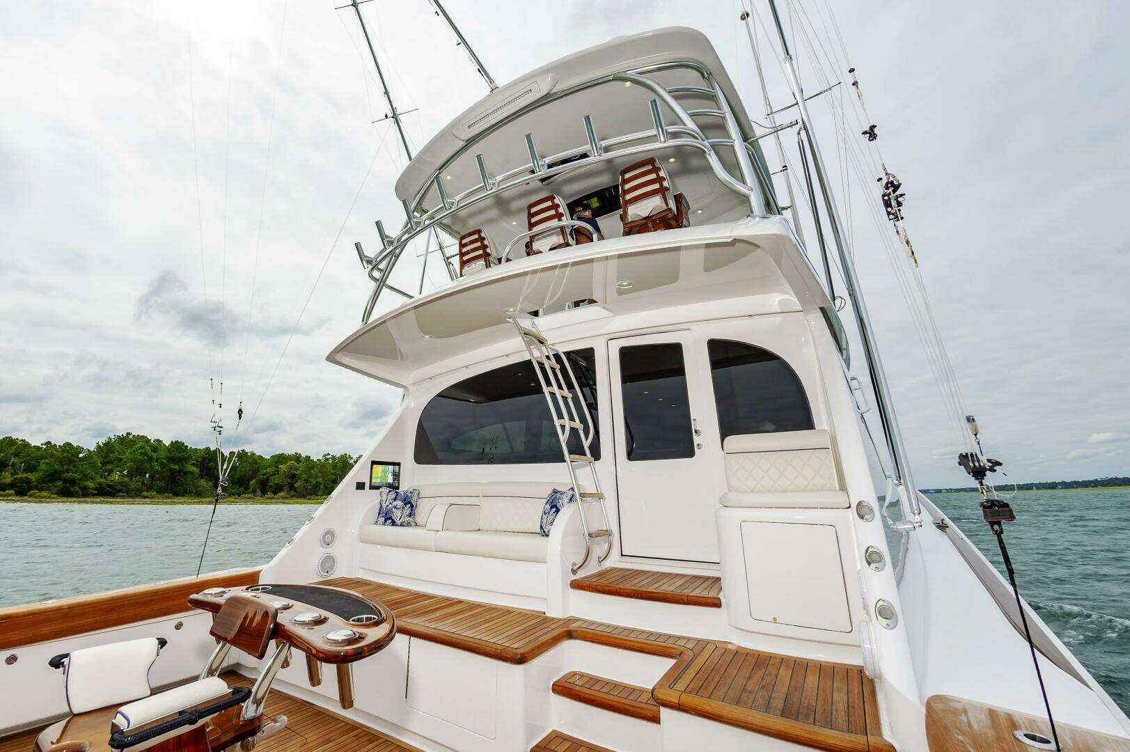- Removable flybridge bench seat backrest forward facing at aft ends of port and stbd bench seats