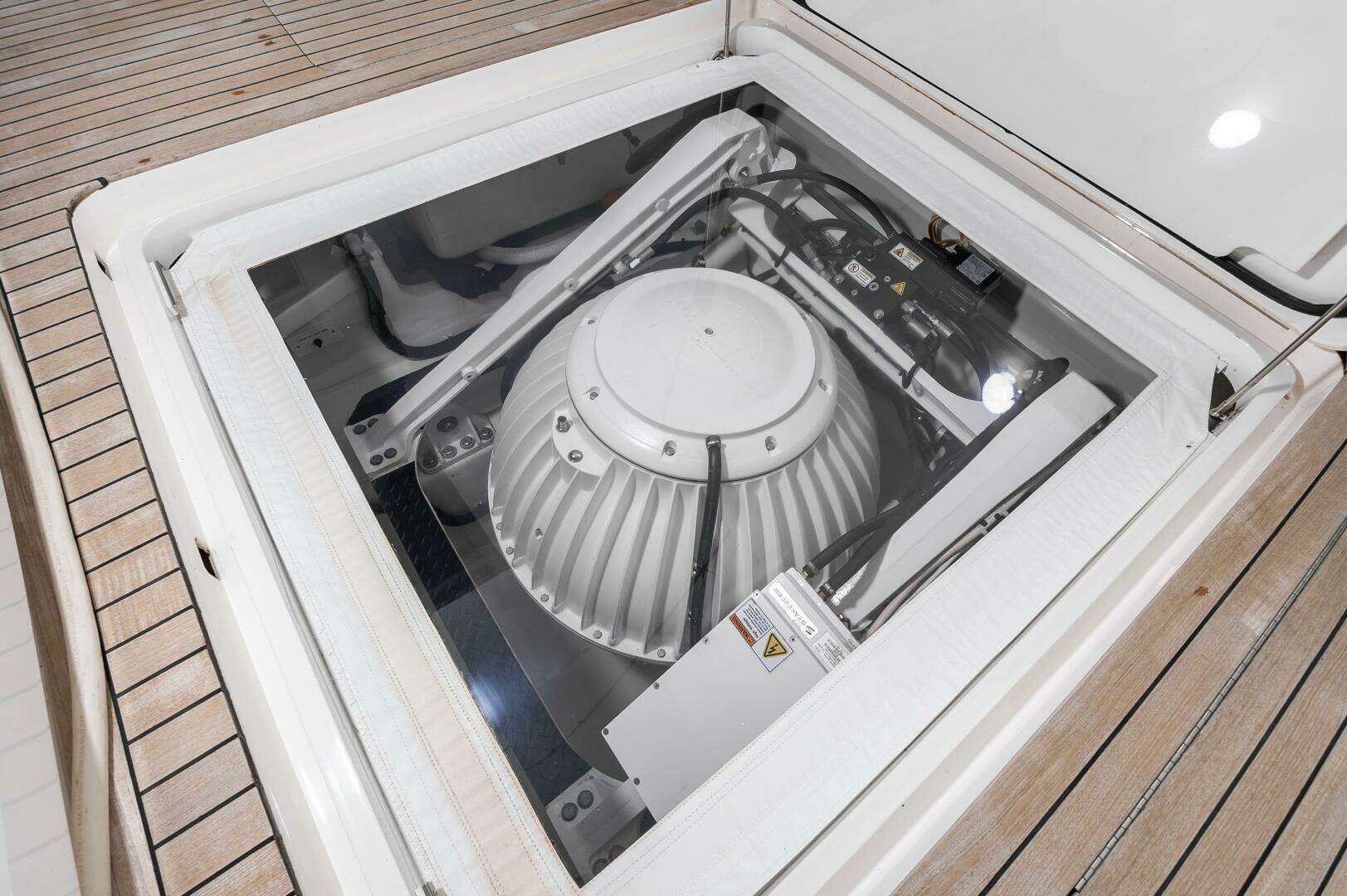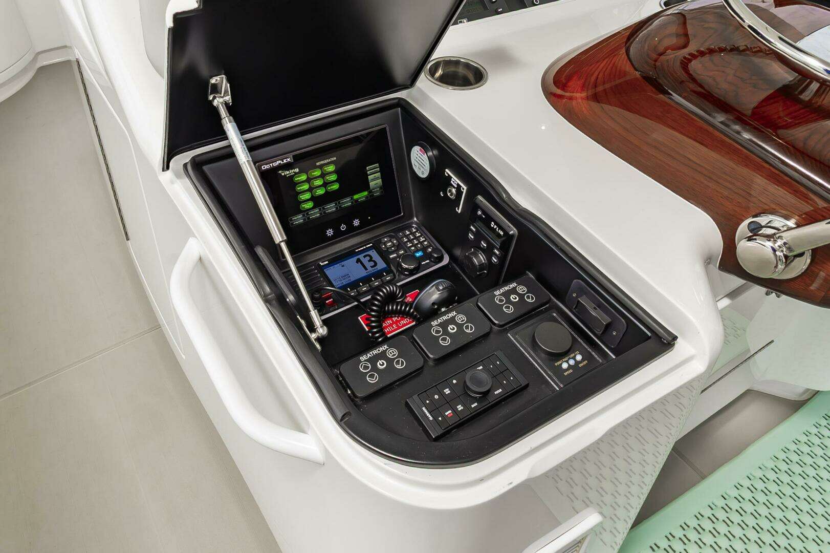 - Recessed electronics box in console for custom electronics package, easily viewable and protected from the elements by acrylic fitted lid with gasket and stainless steel gas pistons
