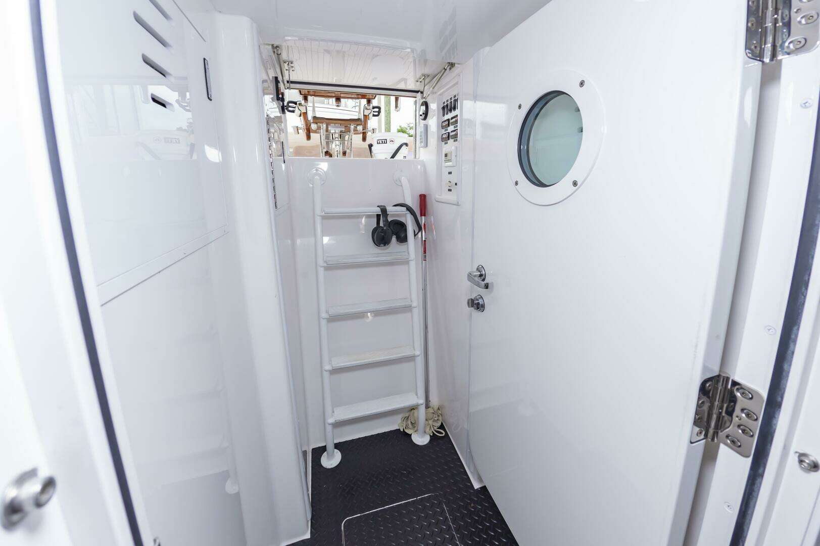 - Under helm access with lights and storage room