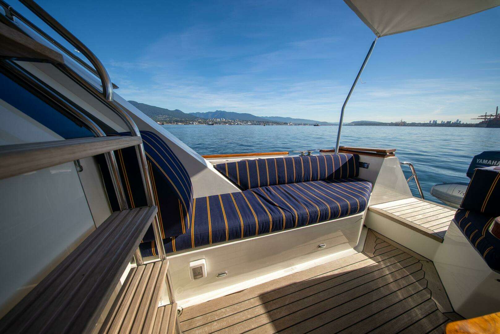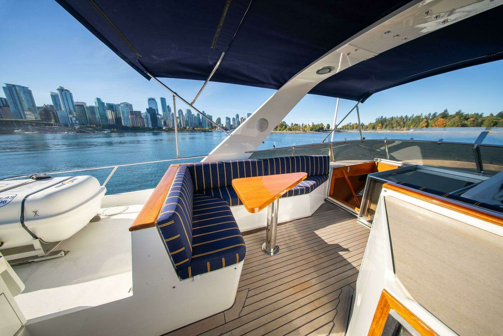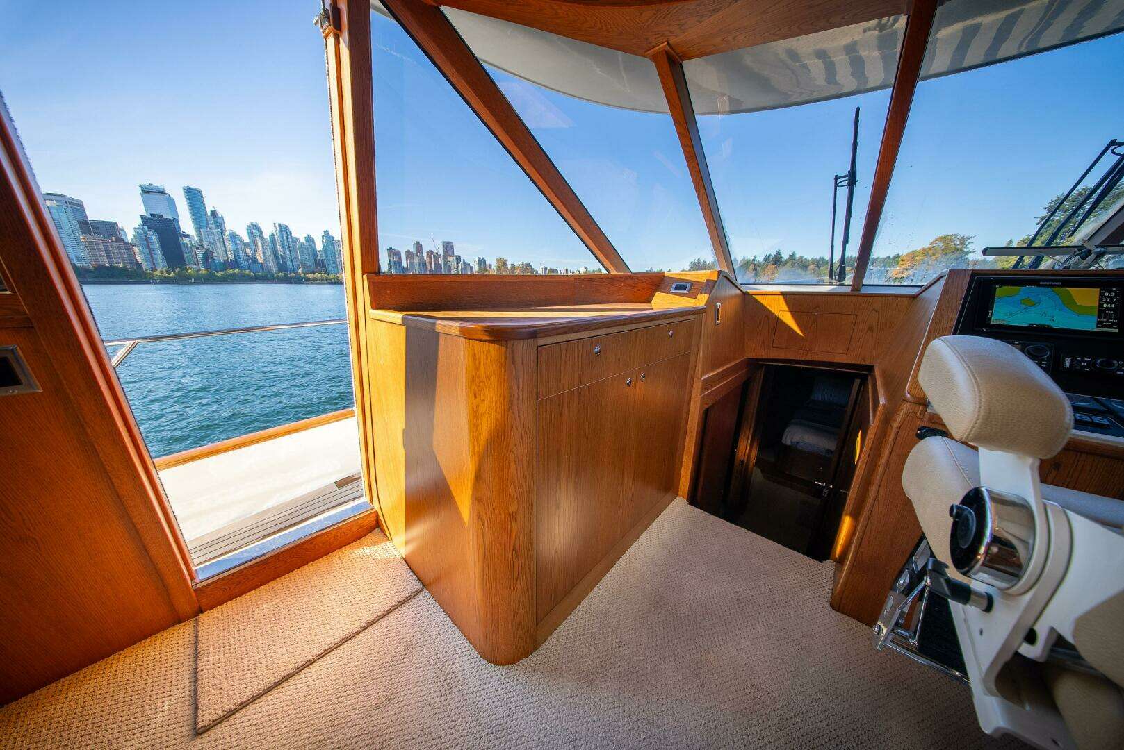 The business area of the ship...Encore's navigation systems have allowed her to safely travel to the most northern spots on British Columbia's coast as well as to Mexico, Florida and the Bahama's. Her reverse angle windshield not only provides a unique look, it also reduces night operations glare and sheds water quicker. In addition to her twin helm seats, there is also a comfy raised bench seat and "nav" table to let the armchair Admiral's assist with the decision making.