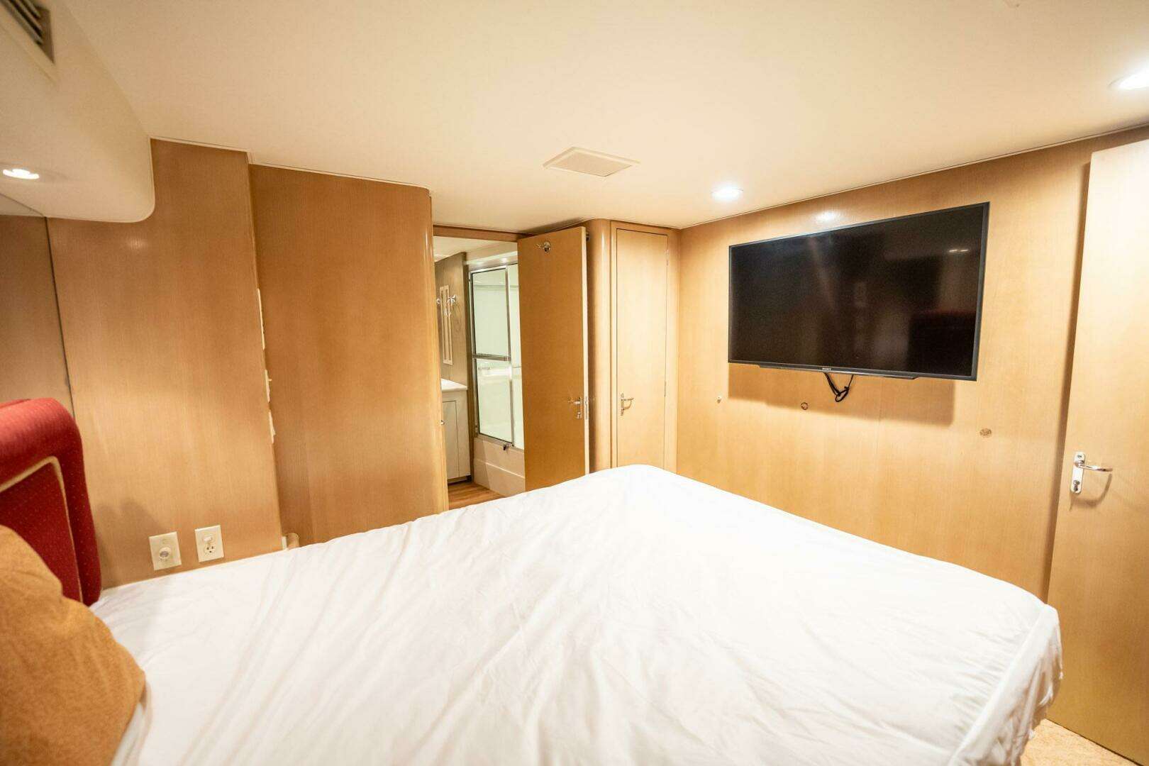 Master Stateroom is accessed thru a staircase midship in the Salon, down the stairs to port are two storage lockers with shelves continuing ahead starboard side leads you to the soundproof engine room door moving forward is the Master Stateroom.