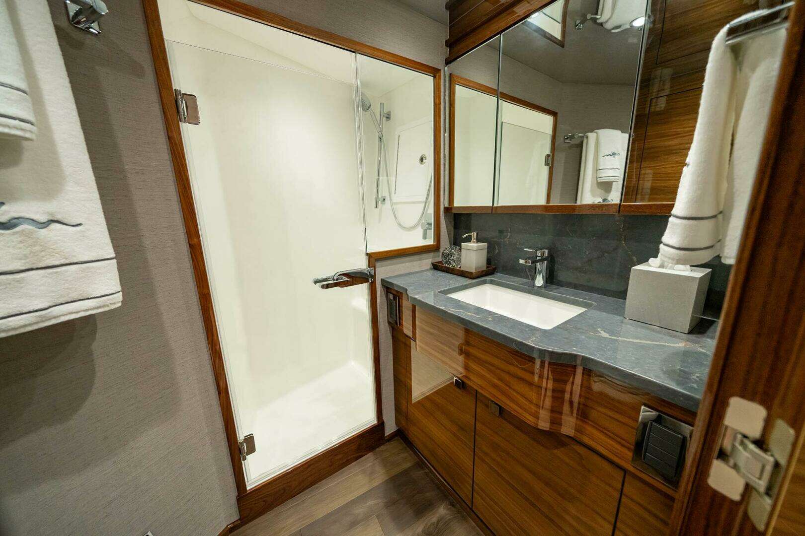 - 217 sq. ft. cockpit with mezzanine seating and Seakeeper stabilization options