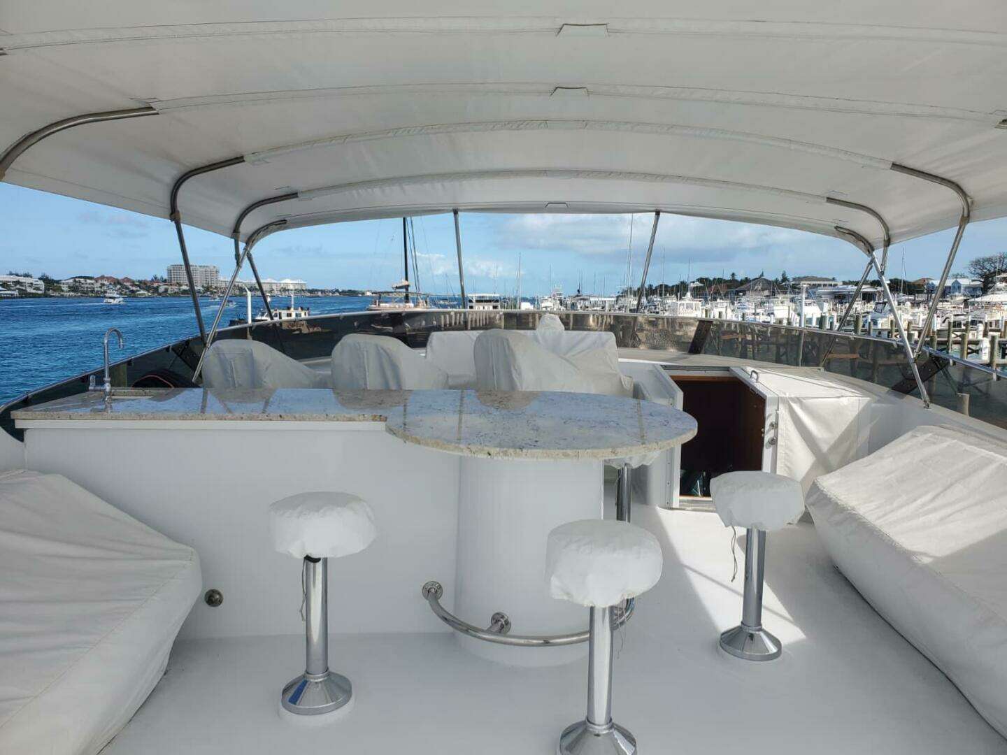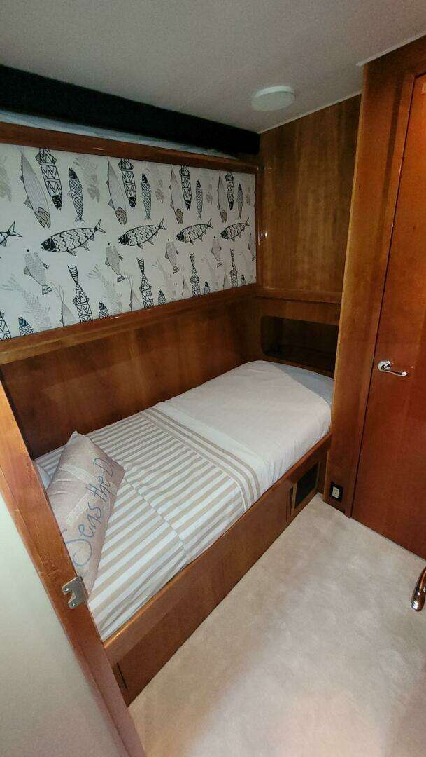 The present owner has gone through this yacht, stem to stern. There is a complete refit of the lower helm and electronics at both helms. The dinette opposite of the galley was removed and the buffet with additional storage, wine chiller, and refrigeration. The galley was refitted as well with new appliances and counter tops. The salon and dining areas received new carpet, new upholstery, new dining table and chairs. All of the cabins received all new soft goods and carpet. The flybridge has all new upholstery as well.