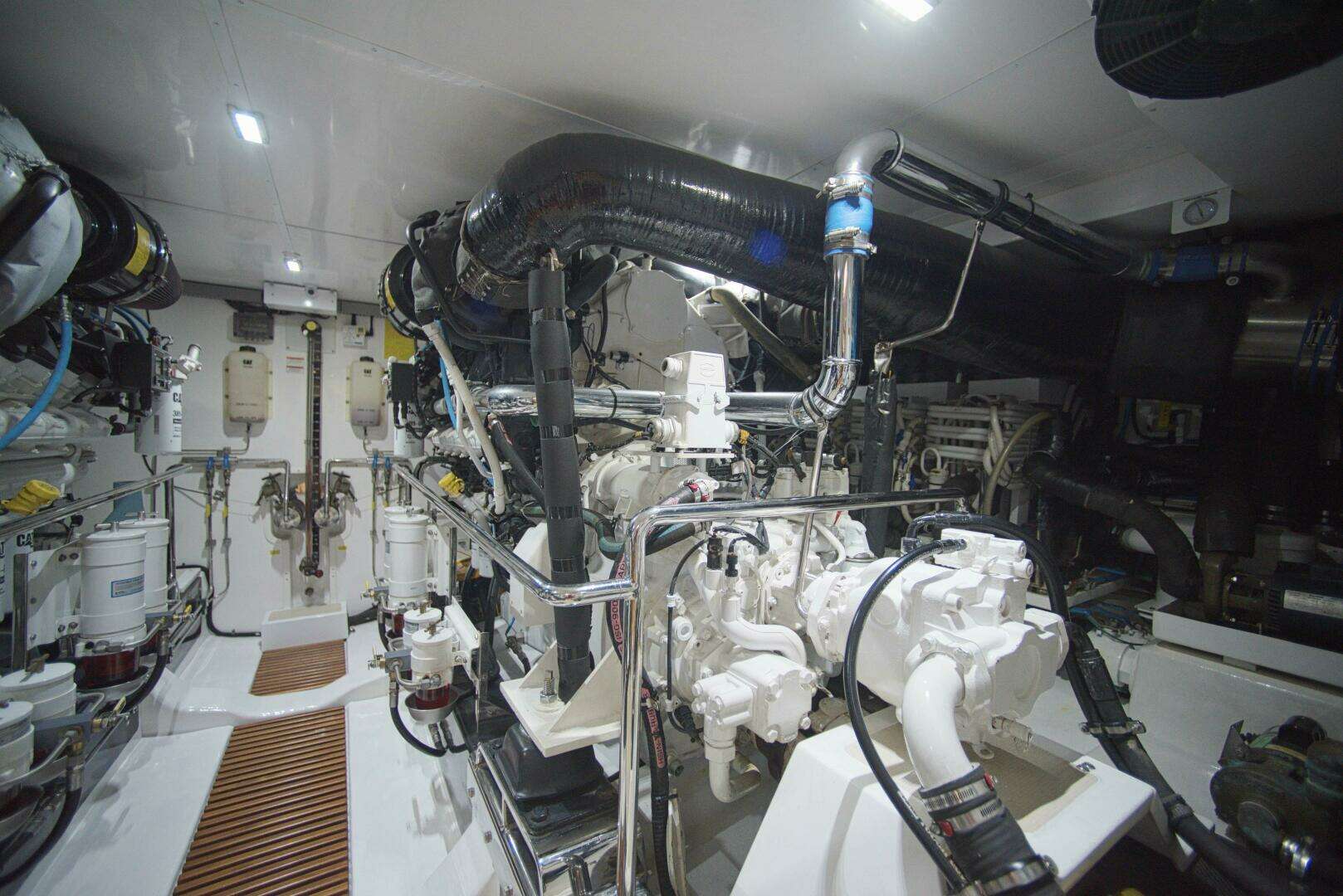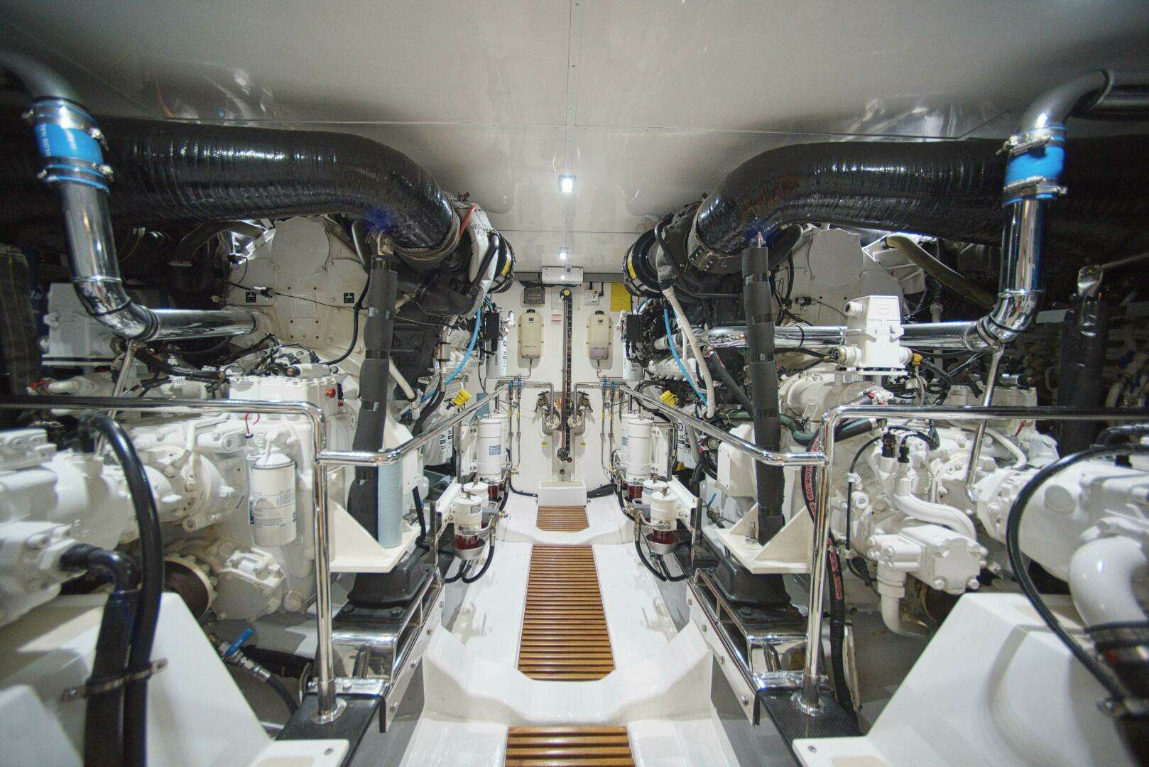 Powered by twin Caterpillar C32 ACERT engines (1800 HP each, 1300 hours), she can reach top speeds exceeding 29 knots. The engines are mounted on soft supports and sit on stainless-steel beds over carbon fiber stringers, minimizing vibration and enhancing performance. A carbon fiber thrust plate absorbs and transfers thrust smoothly to the hull.