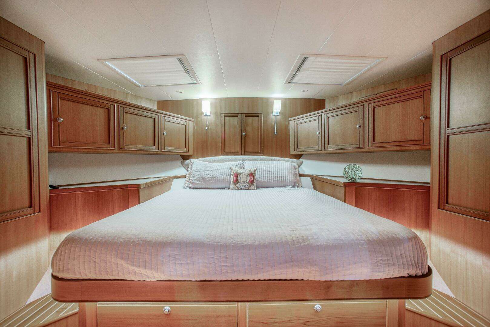 The fully enclosed Command Bridge has the same interior finishes as the rest of the yacht with Teak and Holly floors, and satin teak cabinetry and walls. The area can be opened well-ventilated on nice days by opening the port and starboard command bridge doors, aft door and large overhead hatches. The helm area is beautifully done with all the yachts systems at your fingertips. The captains Stidd Helm chair is accompanied by a double chair to starboard. The captain has access to all the systems on the overhead display panel. This provides the ability to quickly see all warnings, tank levels, voltage levels. To starboard there is an electrical sub panel that provides access to the main breakers that are related to the operation of the yacht. The main display screens are 3 22” Garmin Multifunction displays. The CAT engines have their own displays.