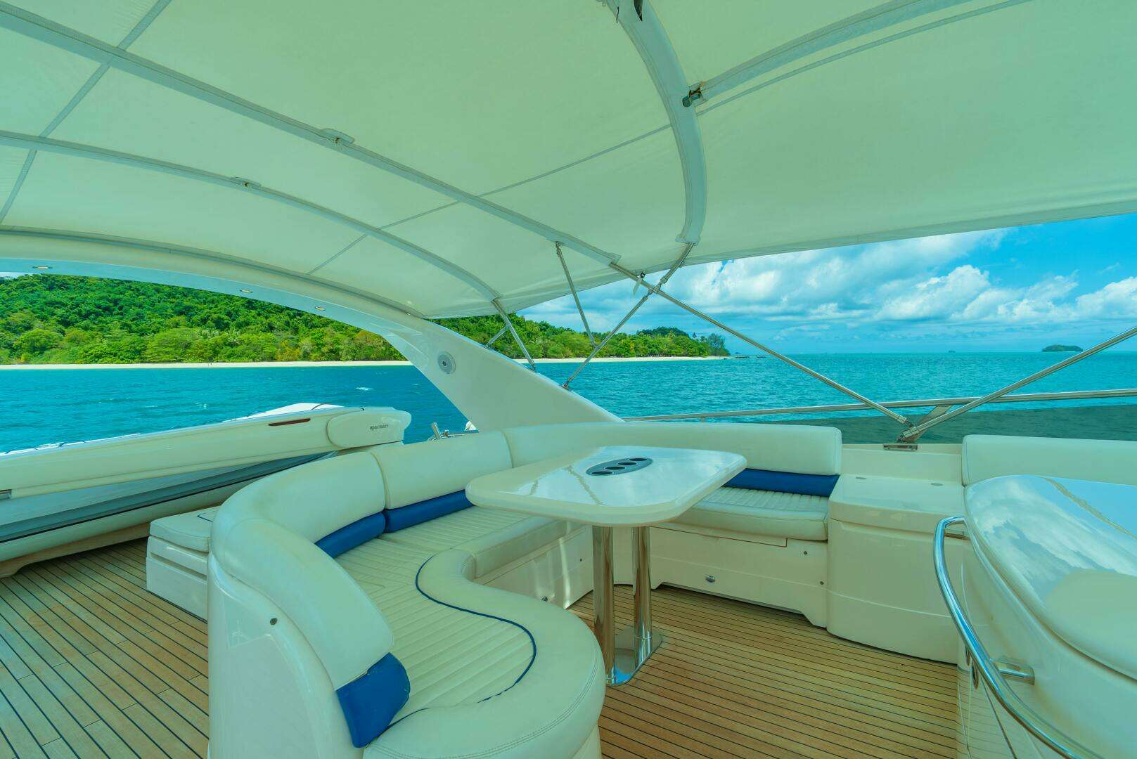 A fixed table with wraparound seating dominates the centre of the area, with a sunpad located aft, and tender and davit crane further aft. More seating extends forward on the port side and all is well shaded beneath the fixed bimini. It's a favorite space for sunbathing, alfresco dining, and enjoying scenic cruising.