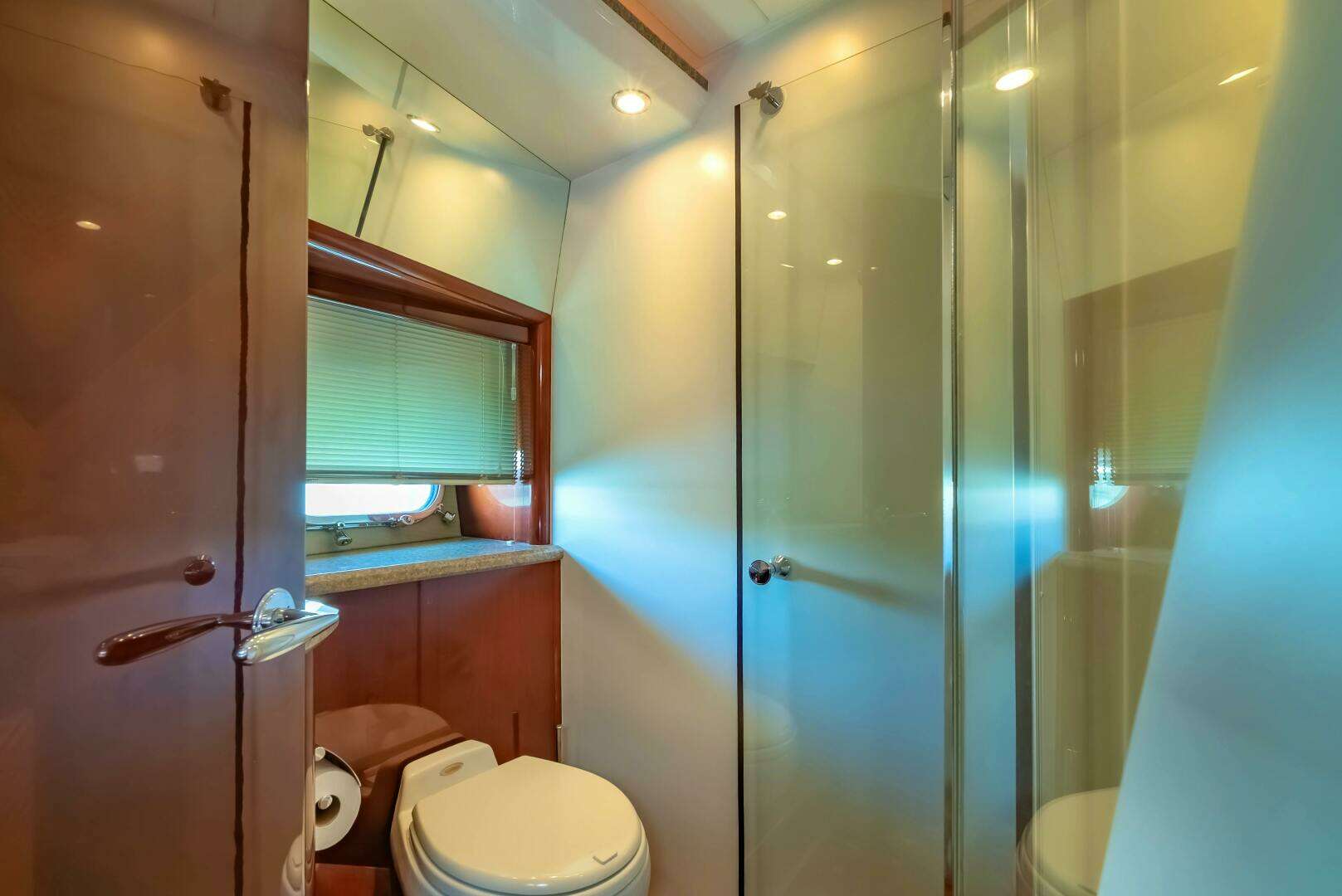 Accessible from the transom or the starboard side deck door, the crew cabin features two single berths and a hanging locker with storage drawers. Air conditioning and lighting make this space comfortable with an opening port for fresh air. The seperate crew head is well sized with WC, basin and a seperate full size shower stall. While modest, it's functional and allows for professional crew on longer journeys.
