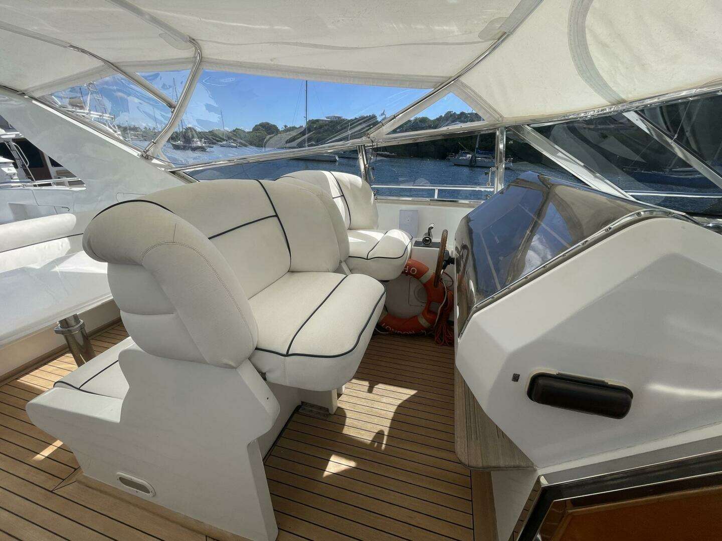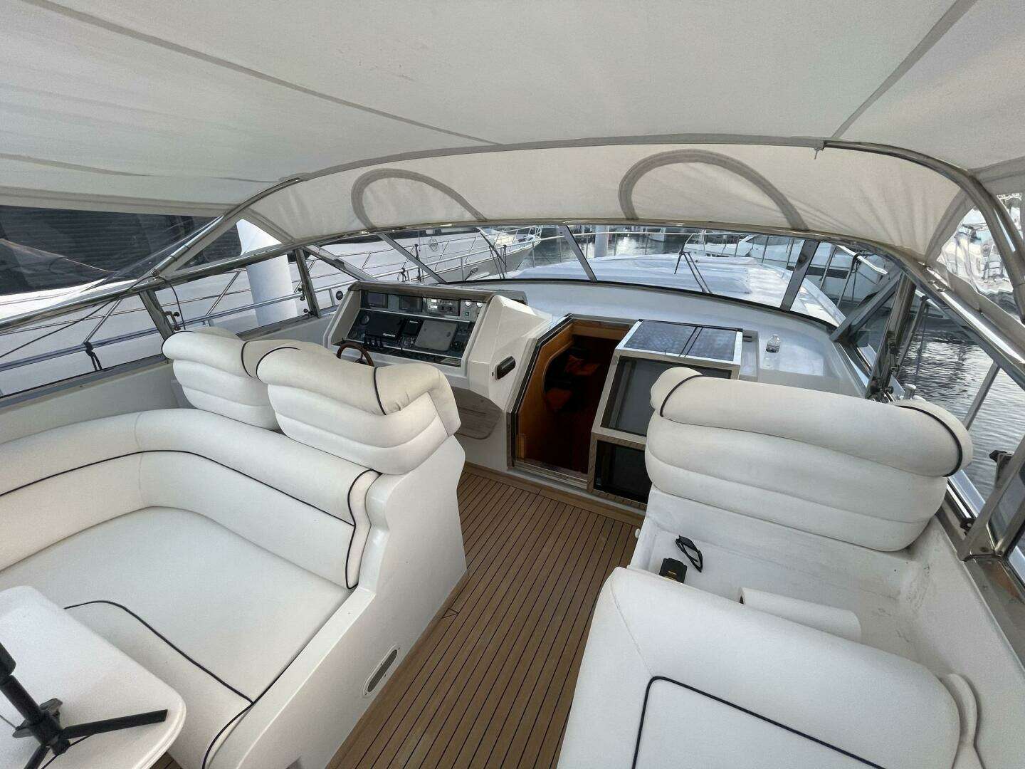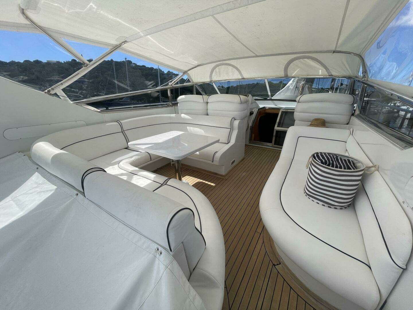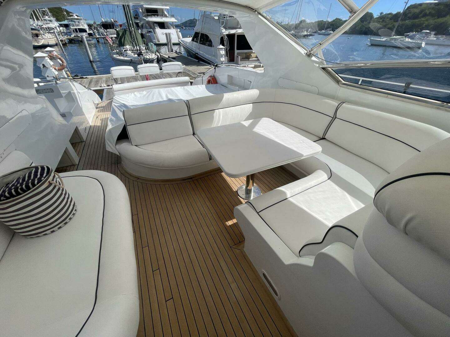 Three Guest Cabins in total; Master queen forward, and port and starboard cabins twins beds, all three cabins have their own head with shower, and vanity. 1 Crew cabin with bunk beds located through hatch in upper deck, with its own head, shower, and vanity. Sleeps 6 guests 2 crew, or 8 guests if private owner. Master cabin has double vanity. There is a dining area in the saloon and also a lounge area, on the upper deck there are 3 large helm seats and also a large u-shaped lounge and table, and an additional chaise lounge. To the stern three large sun pads, and then a large stern seating area on the garage. There is also three large sun pads on the forward deck area.
