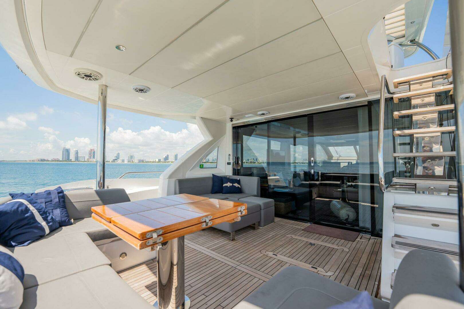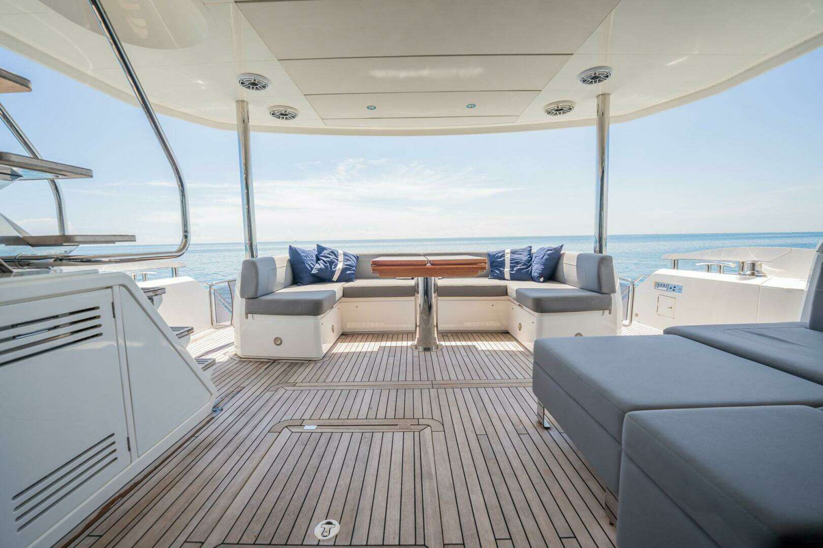 - Aft deck with U-Settee, folding teak table, wet bar, fridge, and ice maker
