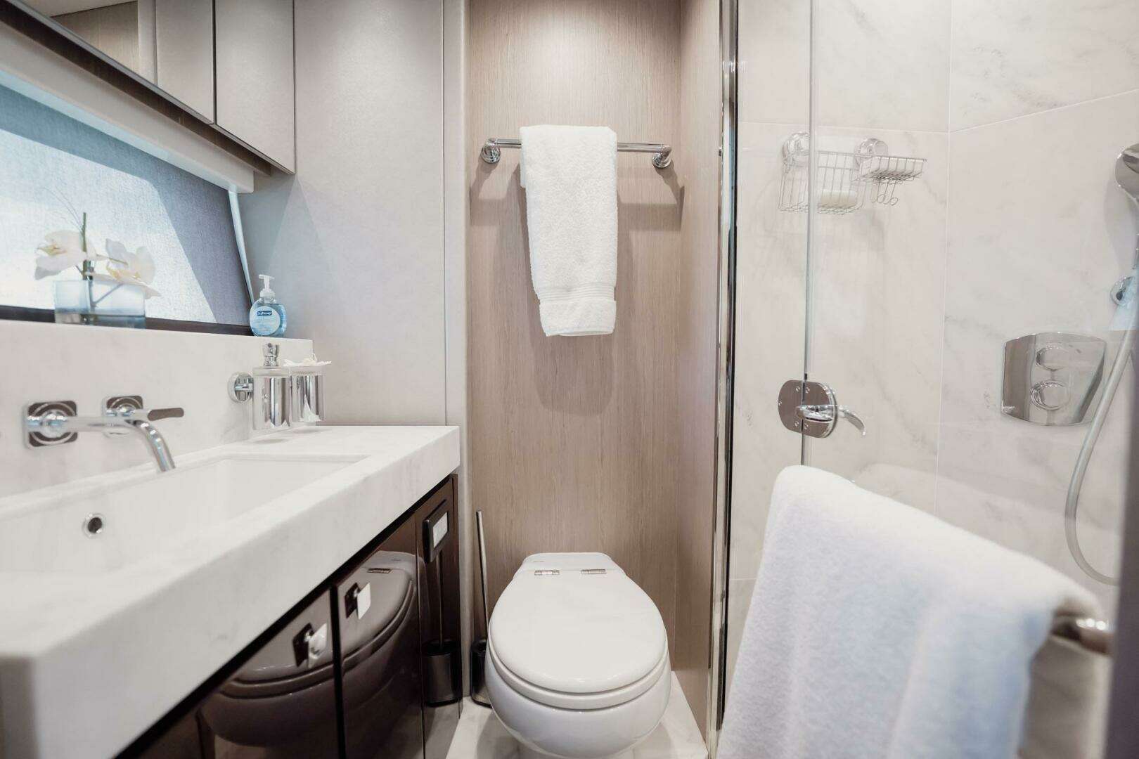 - Crew Quarters: Double berth, settee, laundry, nav station, en-suite head, engine room access