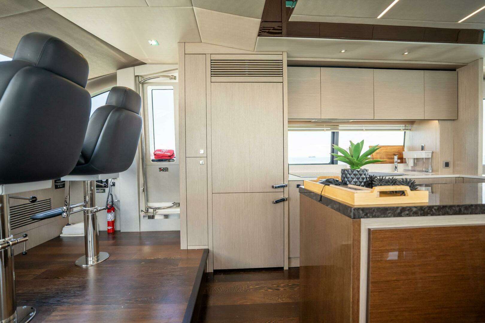 - Open galley with Miele appliances, Sub-Zero refrigeration, and wine cooler