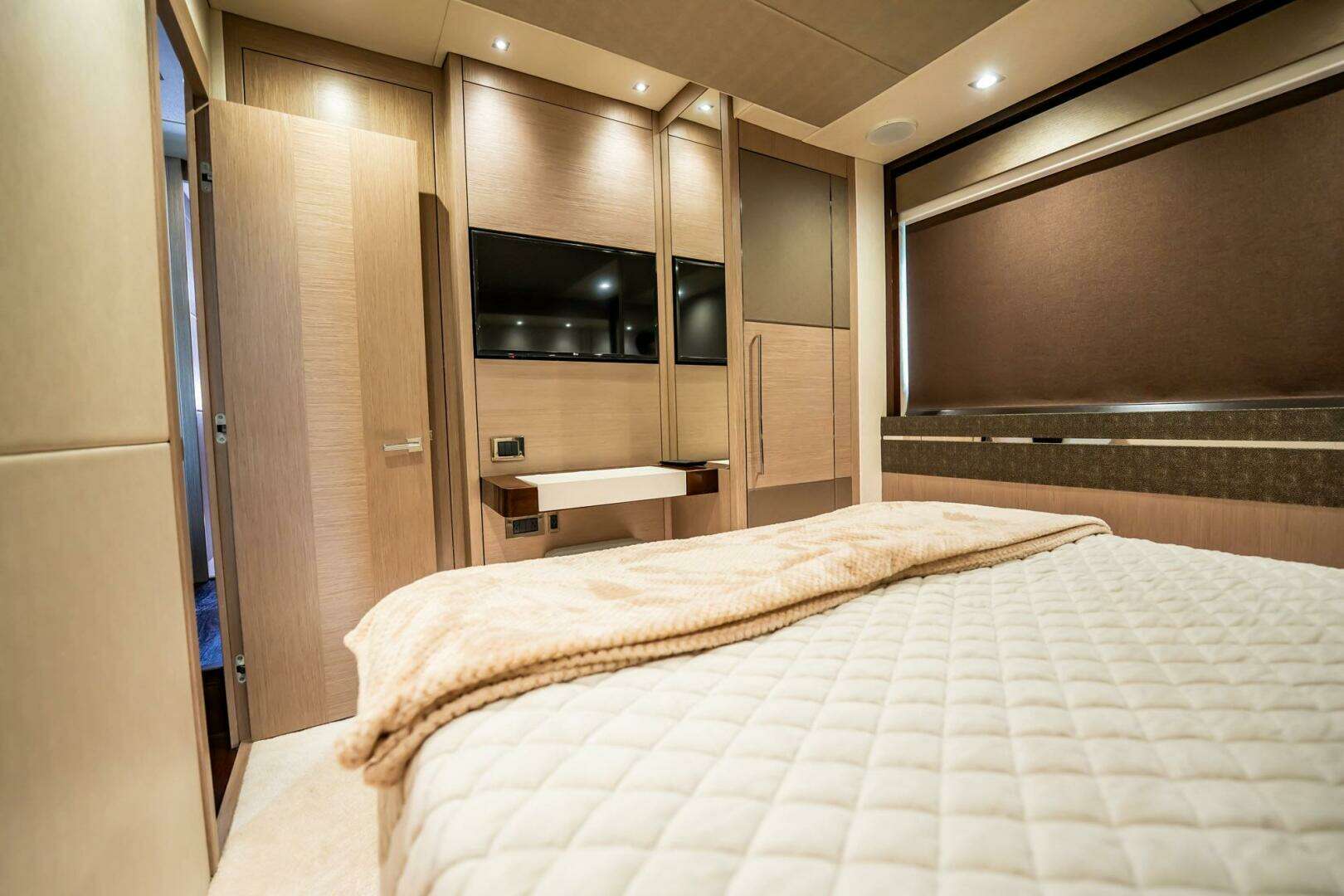 - VIP: Forward queen berth, 40” TV, en-suite head