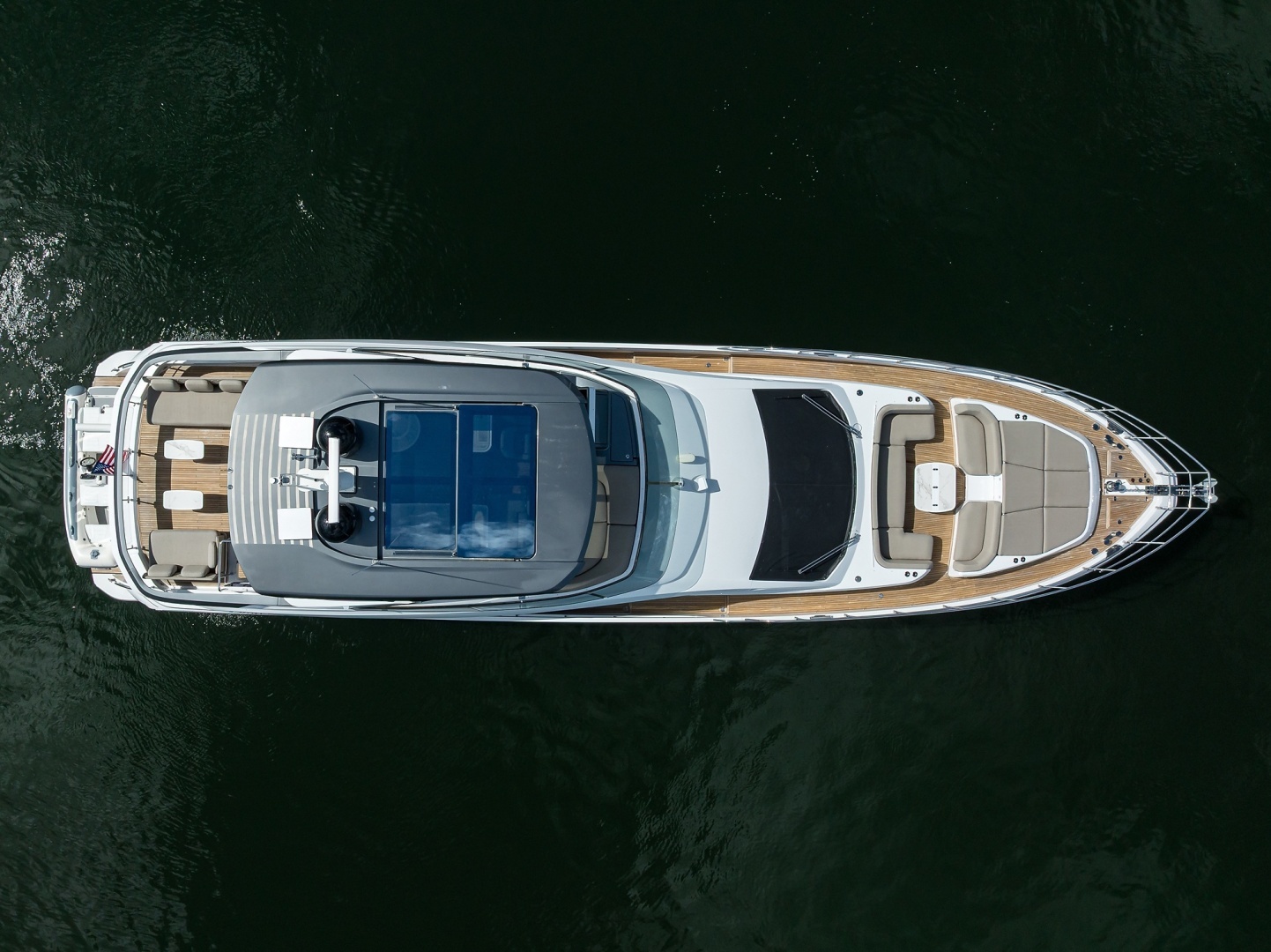 - Expansive flybridge with hardtop and electric opening sunroof