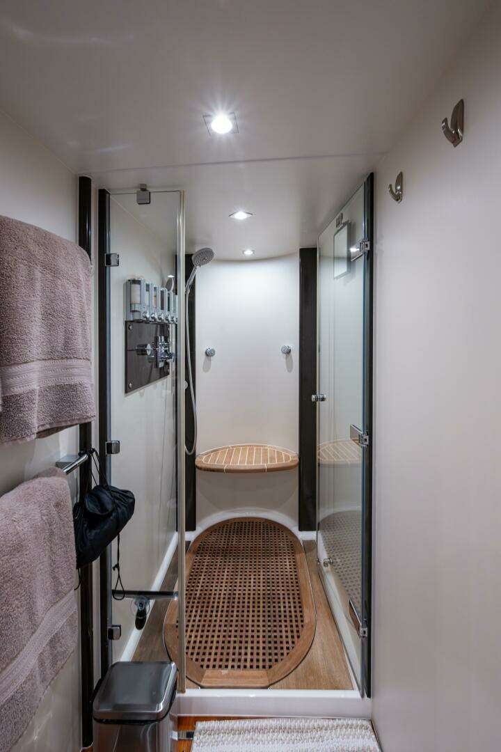 Powered by twin Caterpillar C32A engines, this yacht delivers impressive performance and smooth, quiet cruising. Estimated cruise of 24-25 knots and WOT around 29knots. Her deep-V hull design ensures excellent seakeeping and stability, whether underway or at anchor.