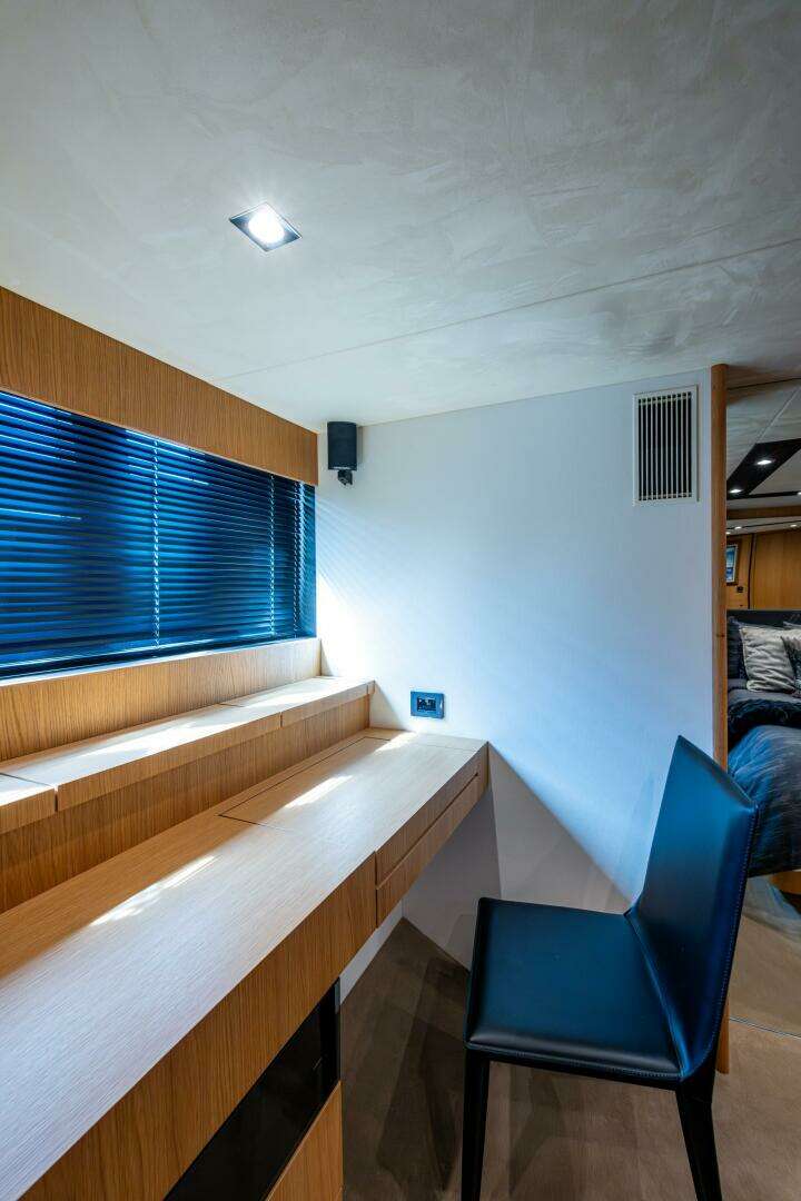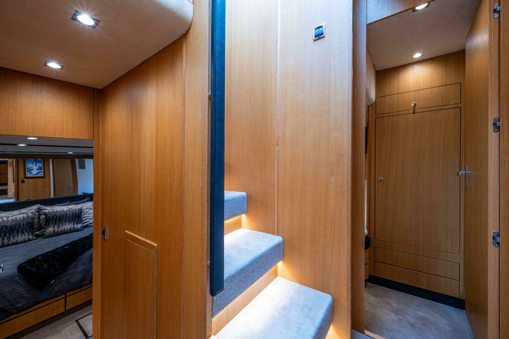 This 78 Squadron offers luxurious accommodations for up to 8 guests in 4 staterooms, plus separate crew quarters aft. The full-beam master suite is beautifully appointed with panoramic windows, a walk-in wardrobe, and a spacious en-suite bath. Additional guest cabins include a VIP forward cabin and two twin guest cabins — each with private en-suite facilities.