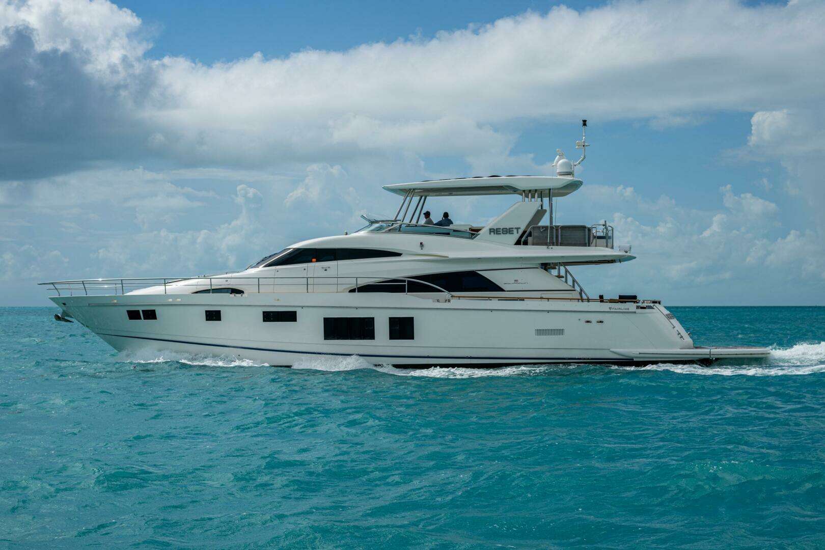 Reset is a pristine 2015 Fairline Squadron 78, a true example of British craftsmanship and elegant design similar to a Princess Yacht and built in the same region of the UK.