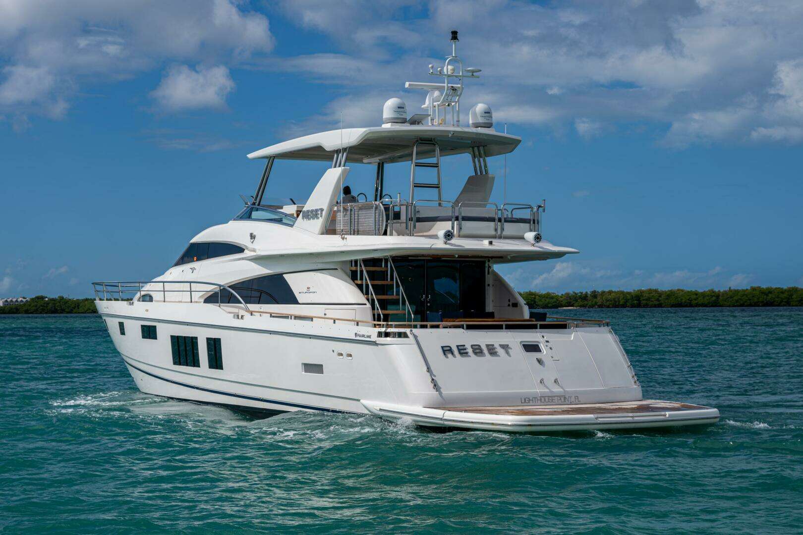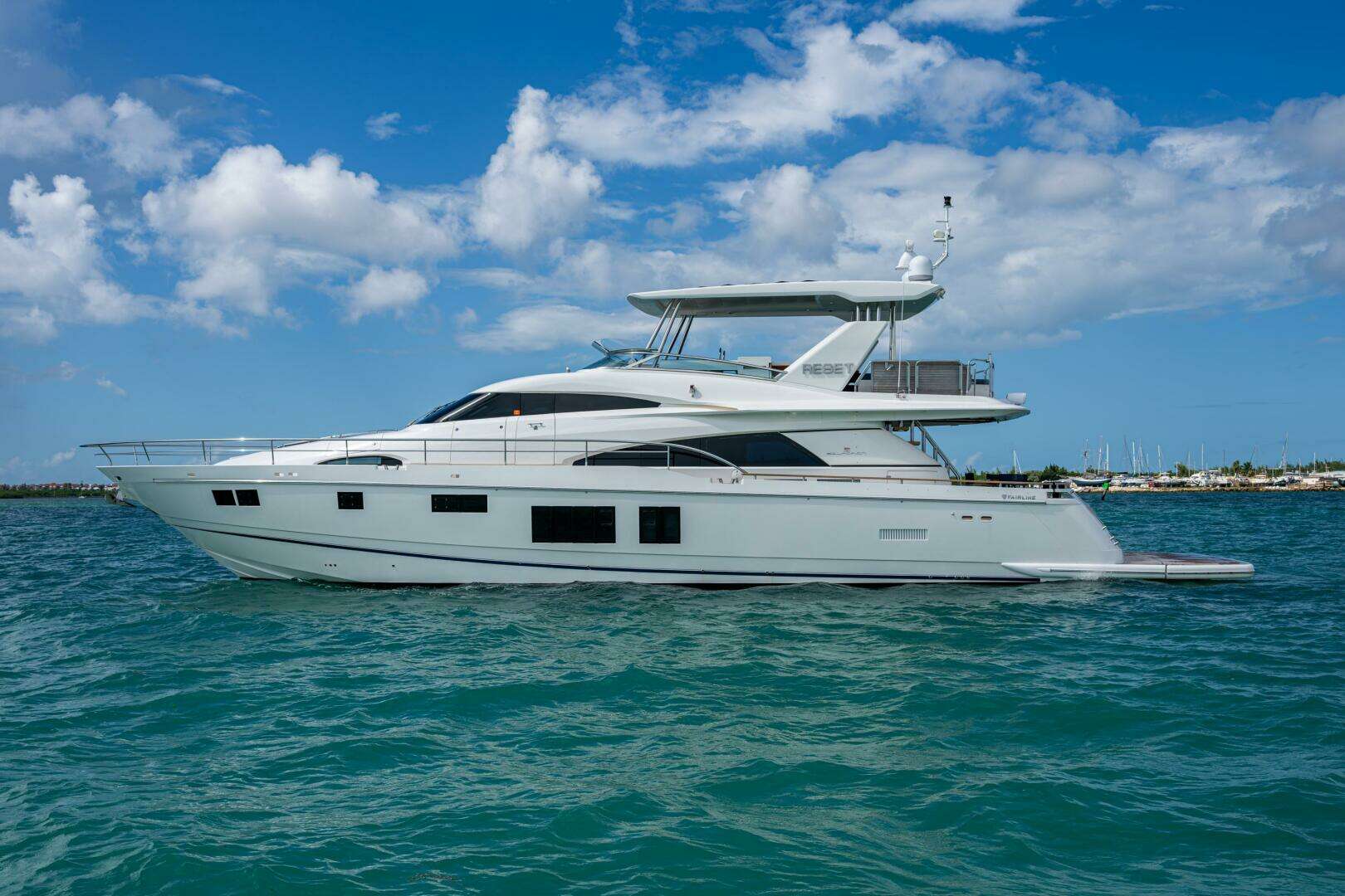 Reset is a pristine 2015 Fairline Squadron 78, a true example of British craftsmanship and elegant design similar to a Princess Yacht and built in the same region of the UK. This yacht blends performance, luxury, and functionality in a way that few others can and she is the Flagship of the Fairline fleet. With Caterpillar C32A engines showing just 800 hours, she has been meticulously maintained by a full-time captain and yacht management company and is ready for immediate cruising. She had a 1000-hour service at 700 hours and just replaced the exhaust system. Fresh bottom paint, prop speed and cutlas bearings replaced on recent haul. Generator recently serviced and a full top-to-bottom detail with fresh wax and refreshed teak.