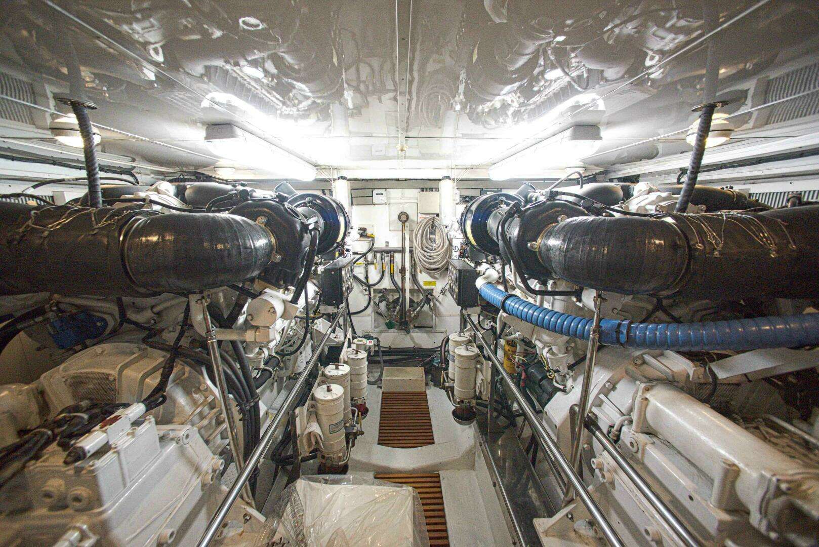 The engine room in Good Answer is a pleasure to work in. She has full standup headroom and great access to all equipment. There are fans to supply and extract air so you can manage airflow. The engine room has heavy soundproofing and you will find the yacht is quiet inside even when using most of her 3,600 HP. The fuel tank is near the center of buoyancy and is one large tank, so there is no need to monitor multiple tanks or transfer fuel. The engine room is air-conditioned so the space can be kept cooler and dryer making it easier to keep down surface corrosion and the service technicians will really appreciate this as well.